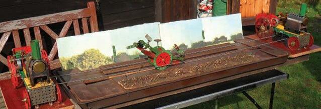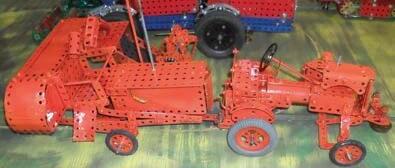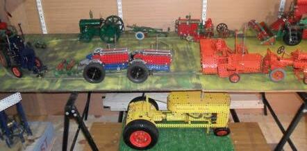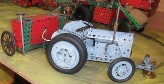 Mick makes agricultural items along with construction and fairground rides. These are electric (battery) or live steam powered, many of which run around a track . If showing the steam powered models, a calm day is required as any wind soon takes heat away from the small boiler. The rally theme for this year are the E27N and MM tractors, Mick having made his interpretation of these in Meccano. Mick made several different models during lockdown, two of which are what every farm should have; a little Grey Fergie and a bow axle Allis B with trailed combine.