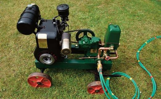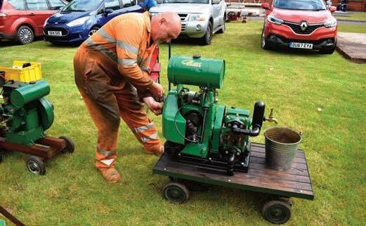 Brian Mellor brought along two air-cooled engines, here he is starting a Petter 'Universal' which is direct coupled to an Edwinson pump, an unusual manufacturer. The water for the display was provided by a Lister 'Domestic' pump driven by a 1948 B.S.A. E series air cooled engine.