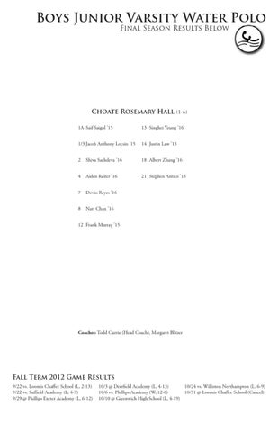 Fall Term 2012 Game Results 9/22 vs. Loomis Chaffee School (L, 2-13) 9/22 vs. Suffield Academy (L, 4-7) 9/29 @ Phillips Exeter Academy (L, 6-12)