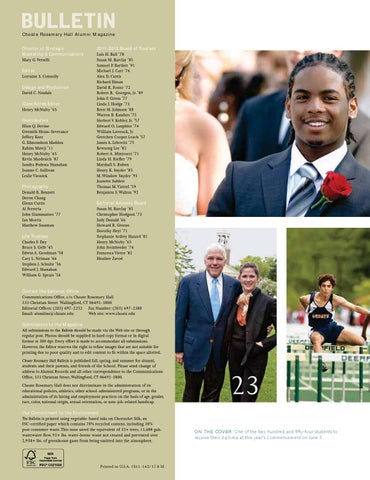 Choate Rosemary Hall Bulletin is published fall, spring, and summer for alumni, students and their parents, and friends of the School. Please send change of address to Alumni Records and all other correspondence to the Communications OfďŹ ce, 333 Christian Street, Wallingford, CT 06492-3800. Choate Rosemary Hall does not discriminate in the administration of its educational policies, athletics, other school-administered programs, or in the administration of its hiring and employment practices on the basis of age, gender, race, color, national origin, sexual orientation, or non-job-related handicap. Our Commitment to the Environment The Bulletin is printed using vegetable-based inks on ChorusArt Silk, an FSC-certiďŹ ed paper which contains 70% recycled content, including 30% post consumer waste. This issue saved the equivalent of 32+ trees, 13,488 gals. wastewater ow, 92+ lbs. water-borne waste not created and prevented over 2,938+ lbs. of greenhouse gases from being emitted into the atmosphere.