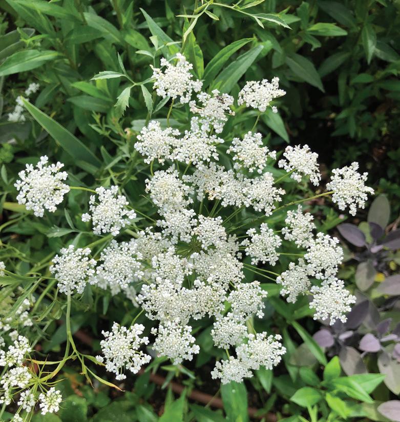 One such plant making a great display in front of the fountain is Ammi majus, commonly called laceflower. It is making a lovely frothy show of delicate white blooms around the more sturdy perennials growing there. Ammi is a member of the Umbelliferae family, therefore related to plants like celery, carrot and wild cow parsley and consequently has the same plate shaped spread of tiny flowers at the top of delicate stems familiar from those plants. It has a wide distribution in the wild through southern Europe, North Africa, west and central Asia. It is thought to be originally native to the Nile valley. It grows well in bright sunshine and well drained soil. The flowers are rich in nectar and pollen, so attract bees and other pollinators. The seeds also attract small birds and are especially loved by goldfinches. The plant is generally disease and pest free, but can be