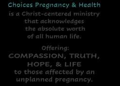 Robyn called the center frantic and explained that she is pregnant and cannot have another child on her own! Her only support person was telling her to abort the baby, which she was planning to do. Robyn told us she had the abortion pills in her hand. I asked her if she would be willing to come into the office and talk to us before she made her final decision. When she walked through our door she was shaking. I feared that she had already taken the first pill and started the abortion process. I started her appointment with a hug (this isn’t a typical thing we do, but it’s amazing how a hug can put someone at ease). Through our conversation she explained that the abortion provider she spoke to didn’t’ go over any risks or side effects with her. We talked it over some more. During that time, the Lord pricked Robyn’s heart and she cried, “I can’t do it. I cannot abort this baby.” Robyn is due in September and we are honored that she is allowing us to walk beside her on this journey. Robyn got more than she bargained for when she came to Choices. She found the positive, loving, healthy support system she needed. All glory to our Lord and Savior Jesus Christ! ~Tammy