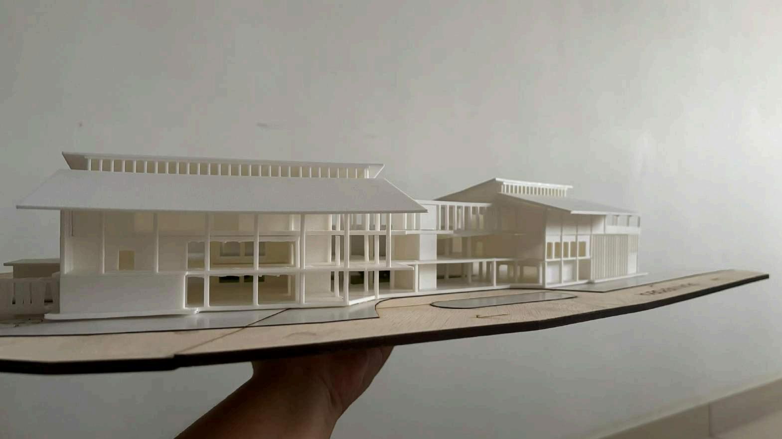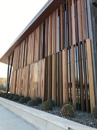 A louvre facade with varying heights and lengths arranged throughout the building creates a sense of layering and intertwines nature with the manmade, similar to how Kuala Kubu Bharu is surrounded by mountains and water.