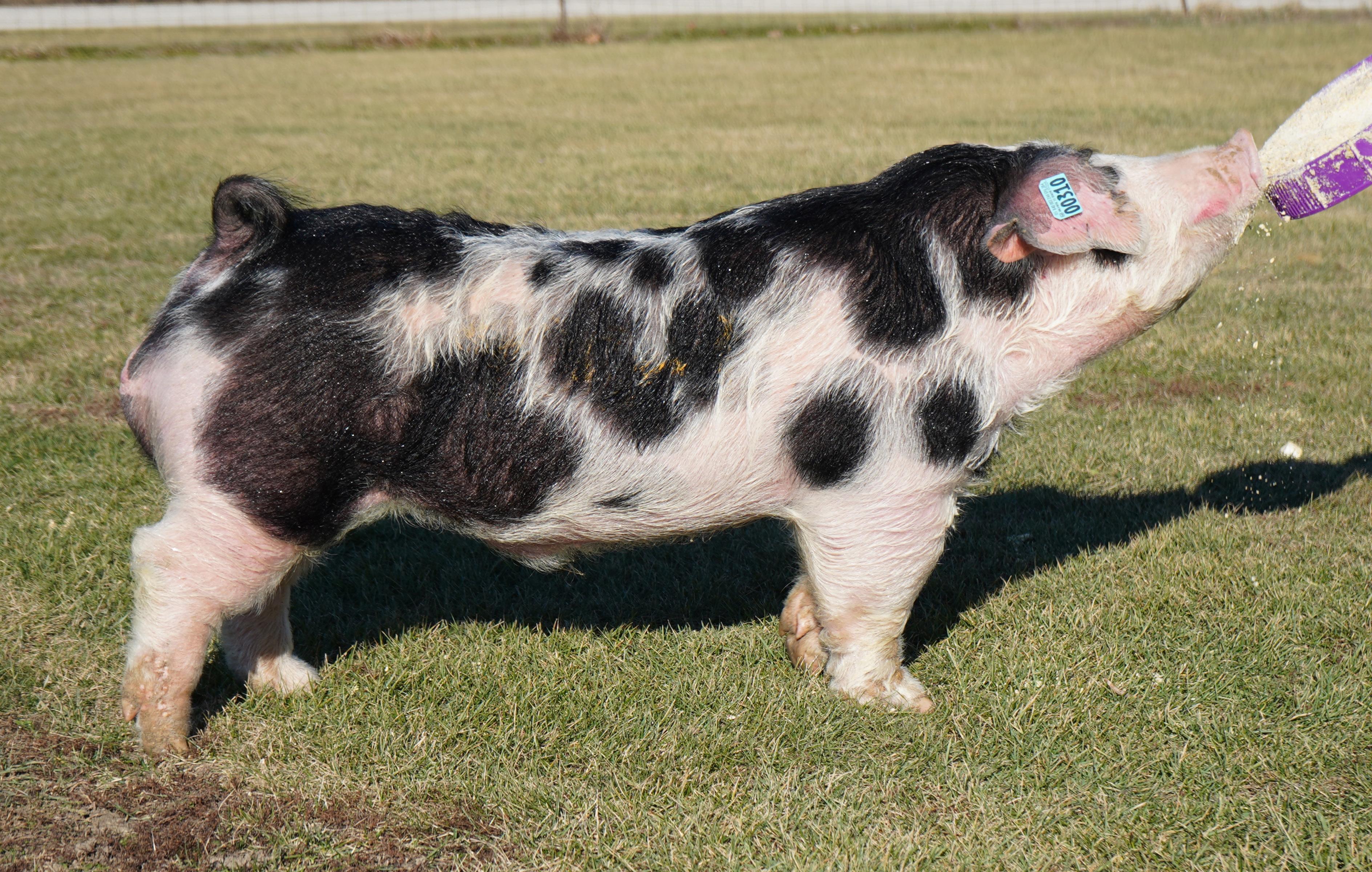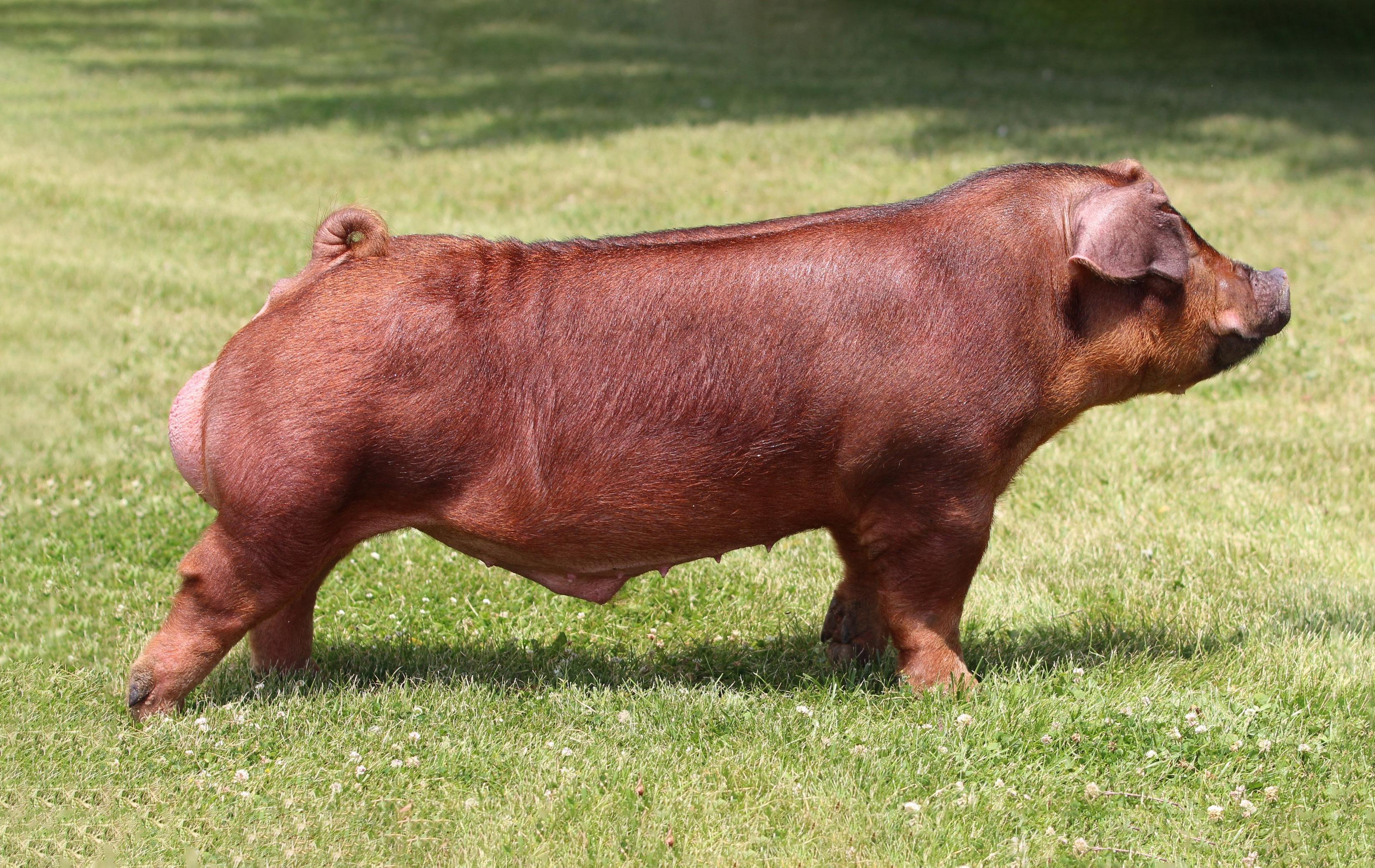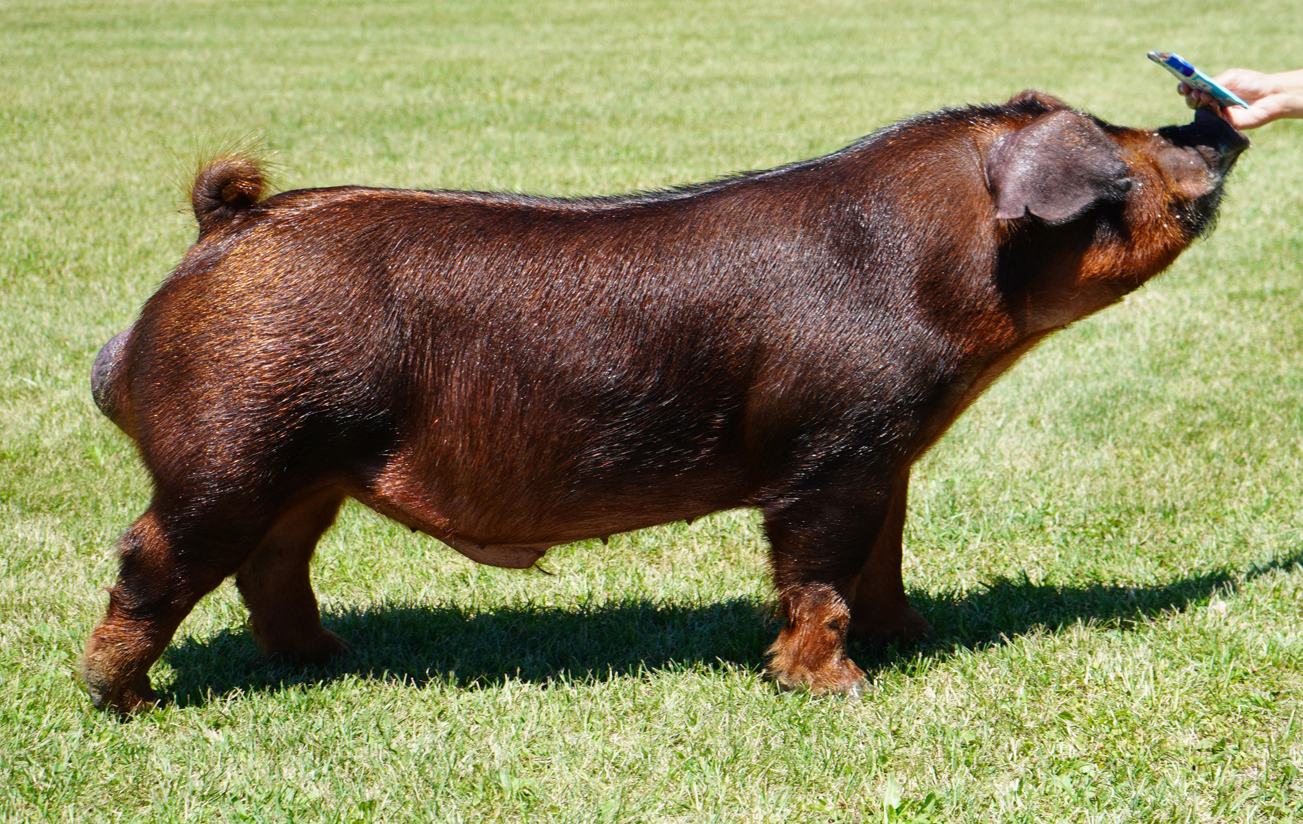 –Kyle had seen this boar as a baby and told me that he was unbelievable, so I knew that I needed to see him as he matured and man did he match up right. –Stout boned with a bold center body and great curvature to his upper rib shape. This guy comes and goes wide at the ground.