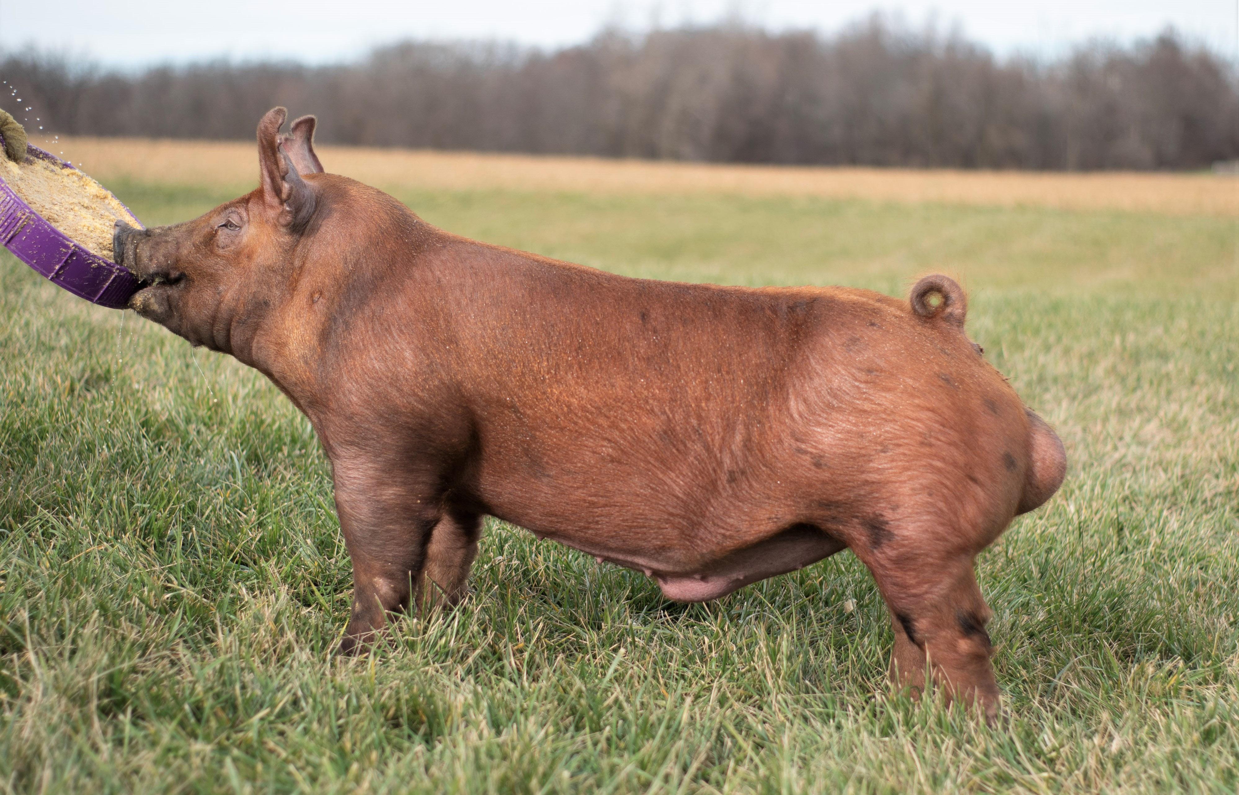 We were excited when Sam called us up to let us know about Catapult. Catapult comes from an awesome sow line that we have been trying to tap into for quite some time and feel blessed we have finally had that opportunity! Catapult’s mother was the 3rd Overall Tamworth Gilt at the 2019 Team Purebred Junior National and she was undefeated on the 2019 Indiana Junior Swine Circuit. Catapult is a Tamworth boar that combines that nature wide and an attractive look from the side. He is square made at the ground, big centered, stout hipped and true in his muscle shape. We feel that guys not only has a powerhouse of a pedigree but is power packed himself!