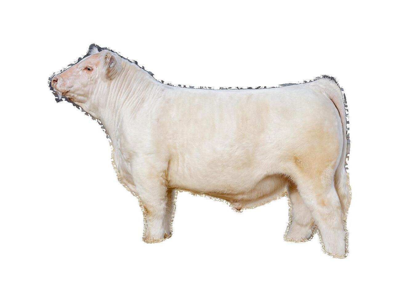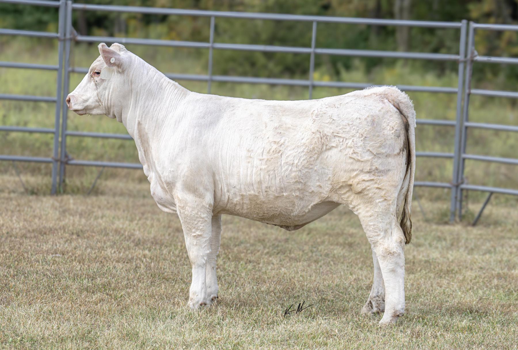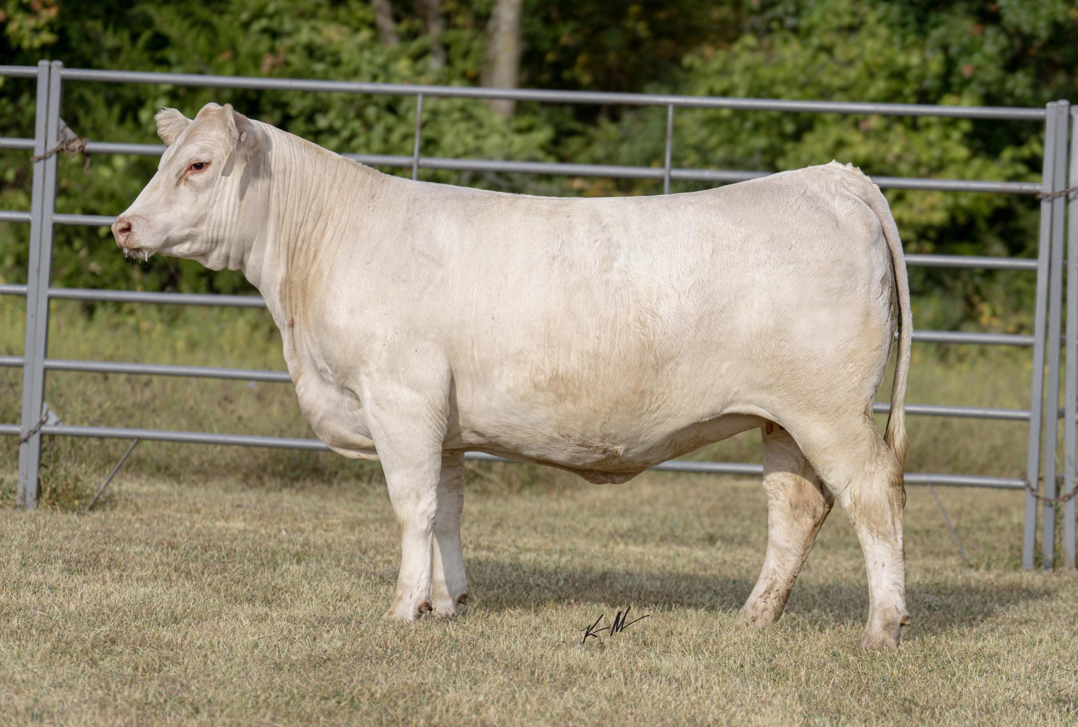 Wright Charolais kept a semen interest in this up and coming young bull when he sold in the March 2023 WC Bull Sale for $18,000 to Brian Ediger. His ideal pattern, type and profile along with his overwhelming IMF marbling ratio of 124 ranked him the #1 yearling bull in his contemporary group of 24 bull mates. Today he ranks in the top 1% of the breed for MARB EPD, top 2% for MILK, top 7% for MTL, top 8% for Calving Ease, top 15% for BW, top 5% for Carcass Weight and top 5% for TSI.