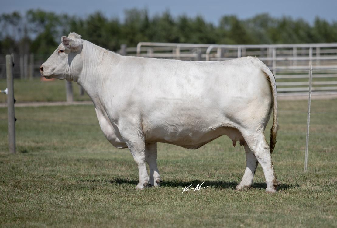 The dam of this bull has been outstanding and is now in the Lyssy purebred herd in Texas. Her 2020 son had an AWW of 815 lbs and her 2023 son had an AWW of 896 lbs and sold for $11,500.