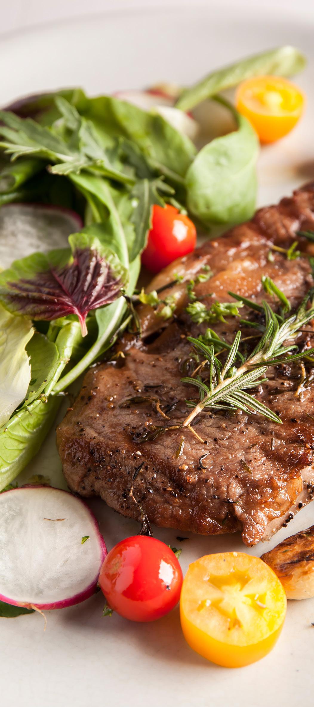 • Slow roasted sirloin steak with a red wine jus, served with buttered green beans on a sweet potato mash