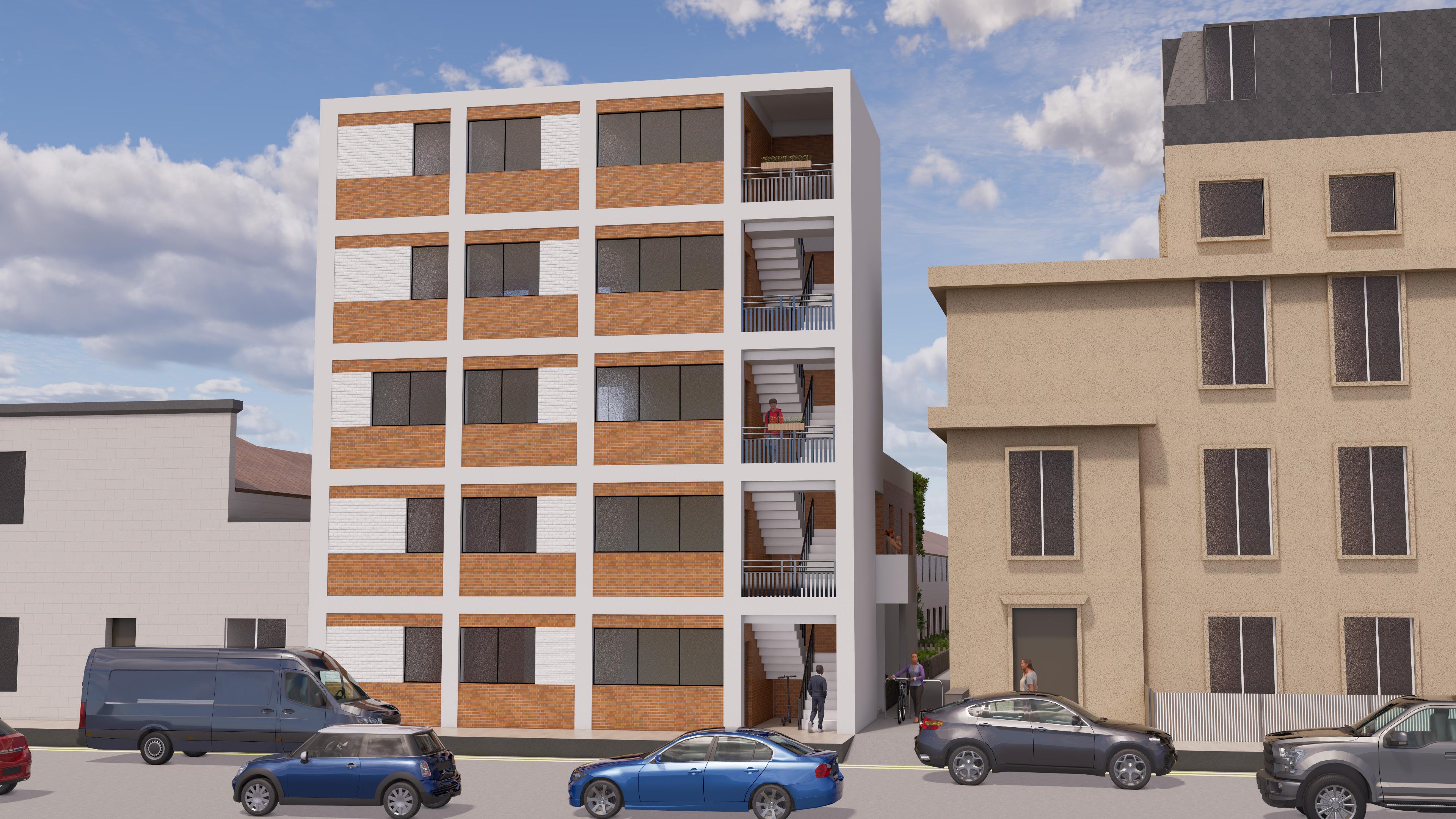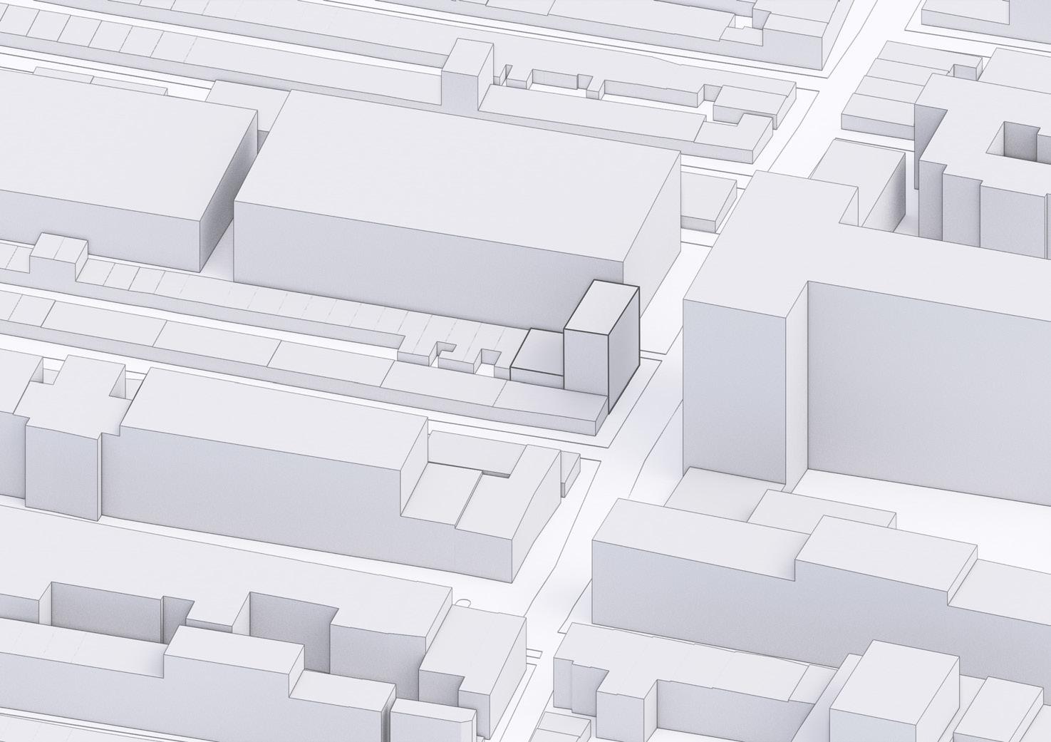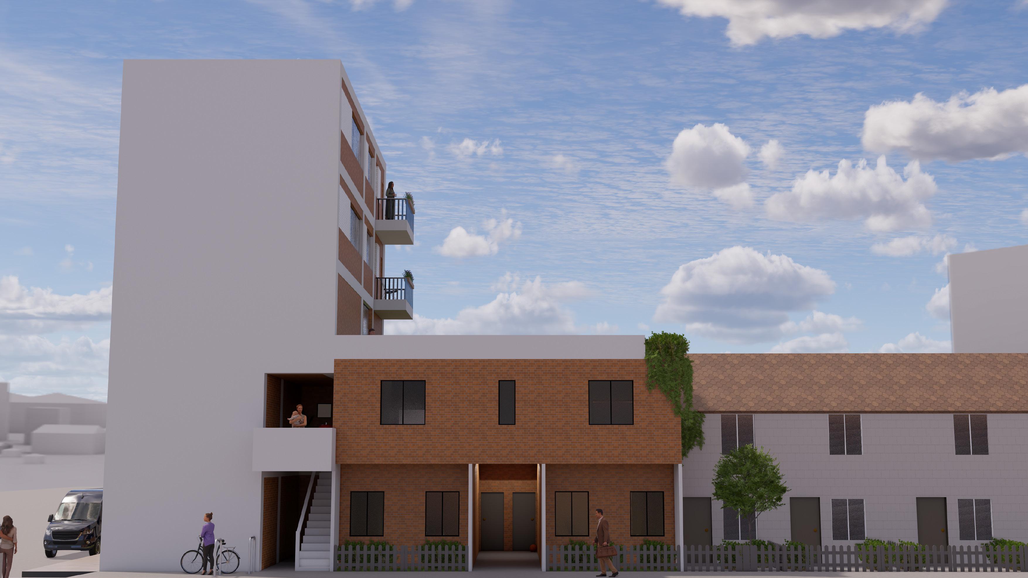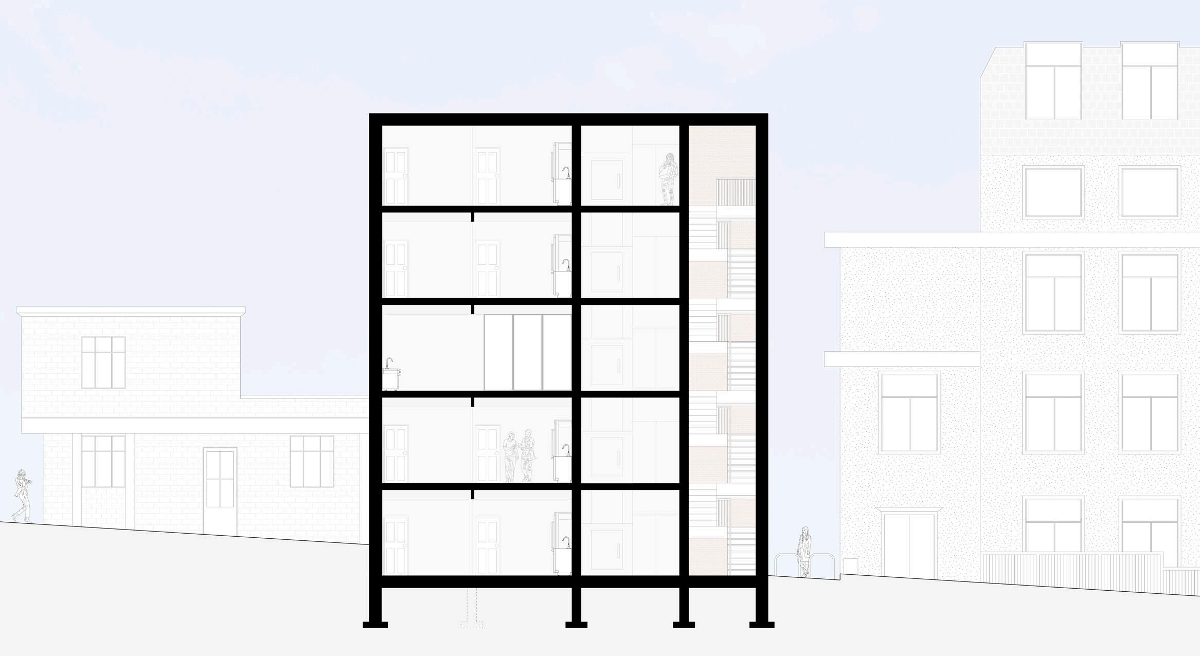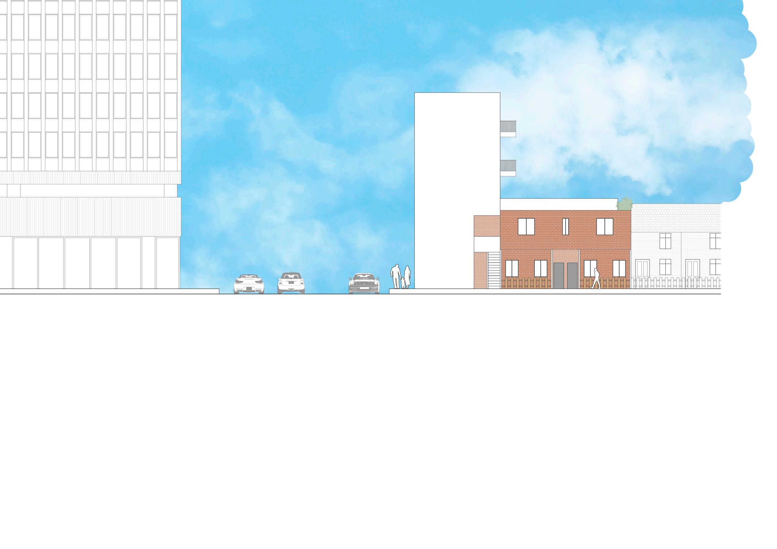 This single housing project develops a small car park into two contrasting types of housing with aesthetic influence from 1960s London Housing. The vertical and horizontal elements of the proposal relates to the adjacent buildings of the site. The vertical element provides a co-housing scheme with a shared co-living floor. The horizontal element provides an individual housing scheme with private entrances and outdoor areas.