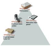 A wood fibre insulation allows for a much lower CO2eq then a PIR or wool based insulation. Also having double-glazed windows instead or triple-glazed results in a -46.7 difference in CO2eq levels.
