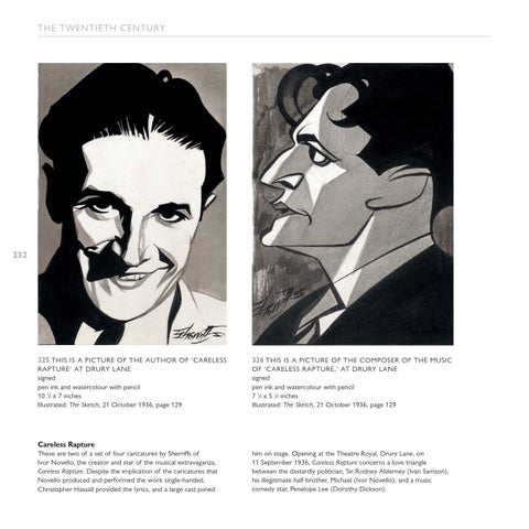 326 THIS IS A PICTURE OF THE COMPOSER OF THE MUSIC OF ‘CARELESS RAPTURE,’ AT DRURY LANE signed pen ink and watercolour with pencil 7 1⁄4 x 5 1⁄4 inches Illustrated: The Sketch, 21 October 1936, page 129