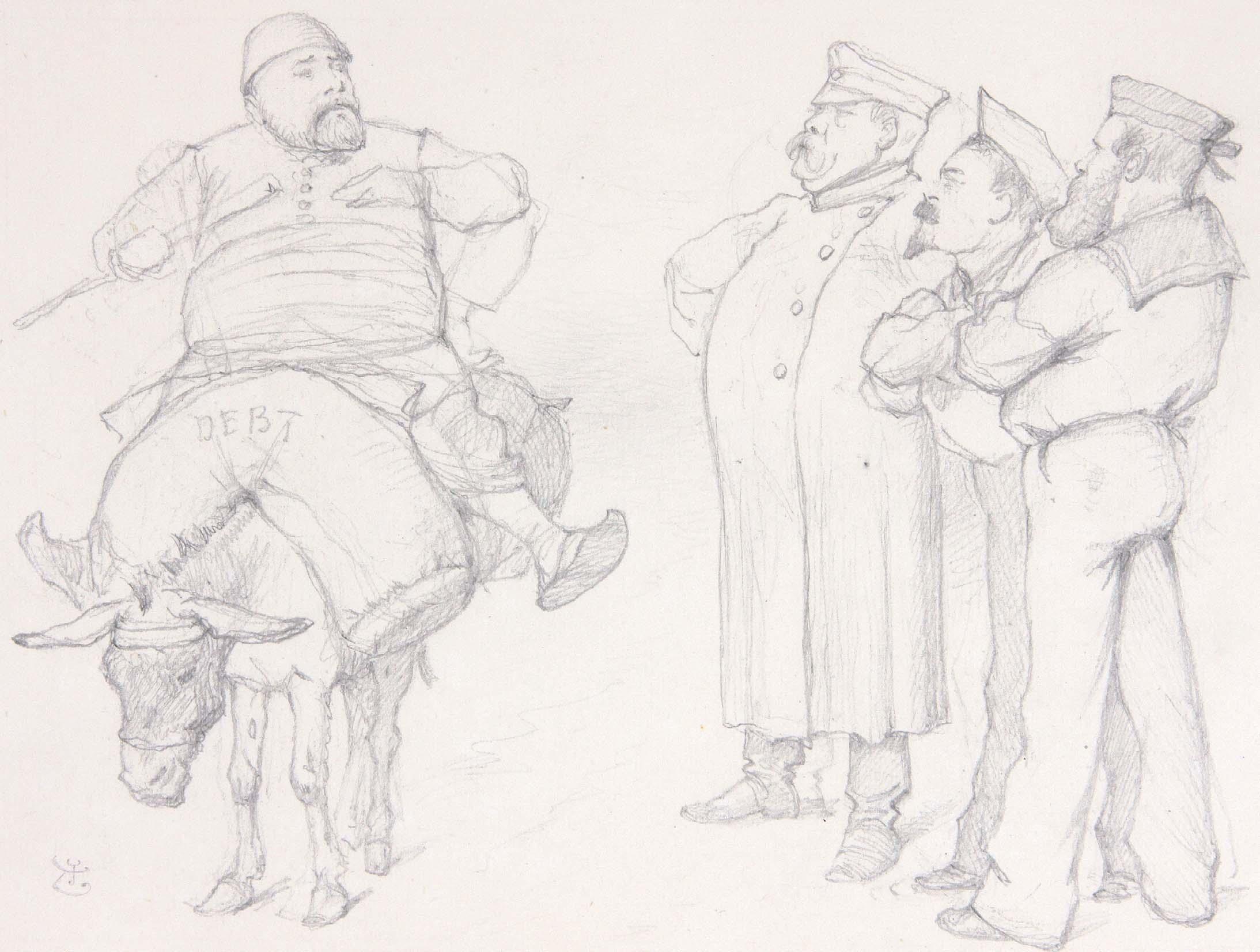 ISMAIL: ‘“GET OFF!” BISMILLAH! WHO’S TO GET ON? ALL THESE FRANKS – OR SON TEWFIK, WITH THE PADISHAH BEHIND HIM? PLEASANT LOOK-O T FOR THE DONKEY, EITHER WAY!’ ‘THE S LTAN’S FIRMAN HAS ARRIVED AT ALE ANDRIA, PRONO NCING THE DEPOSITION OF KHEDIVE, AND THE NOMINATION OF PRINCE TEWFIK IN HIS STEAD.’ – RE TER’S EASTERN TELEGRAM Signed with monogram Pencil 6 ¼ 8 ¼ INCHES Illustrated: Punch, 5 July 1879, page 307