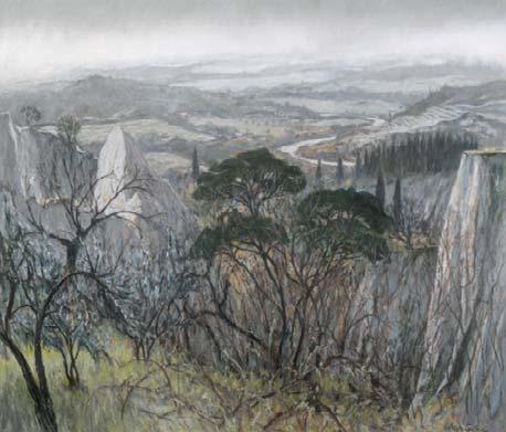 The topography of Tuscany has inevitably encouraged Patrick Cullen to take advantage of the many high points that look down and out across a patchwork of elds bisected by roads or rivers [26, among others]. However, he is always keen to try out other, more unexpected, views, such as up a steep vine-covered hillside to a farmhouse high above [31] or through vegetation, a theme that gives rise to a series of singular variations, from one dominated by an unkempt copse [40] to another featuring burgeoning peach trees [17]. All of these approaches help lure the viewer fully into each landscape to share something of the artist’s own experience.
