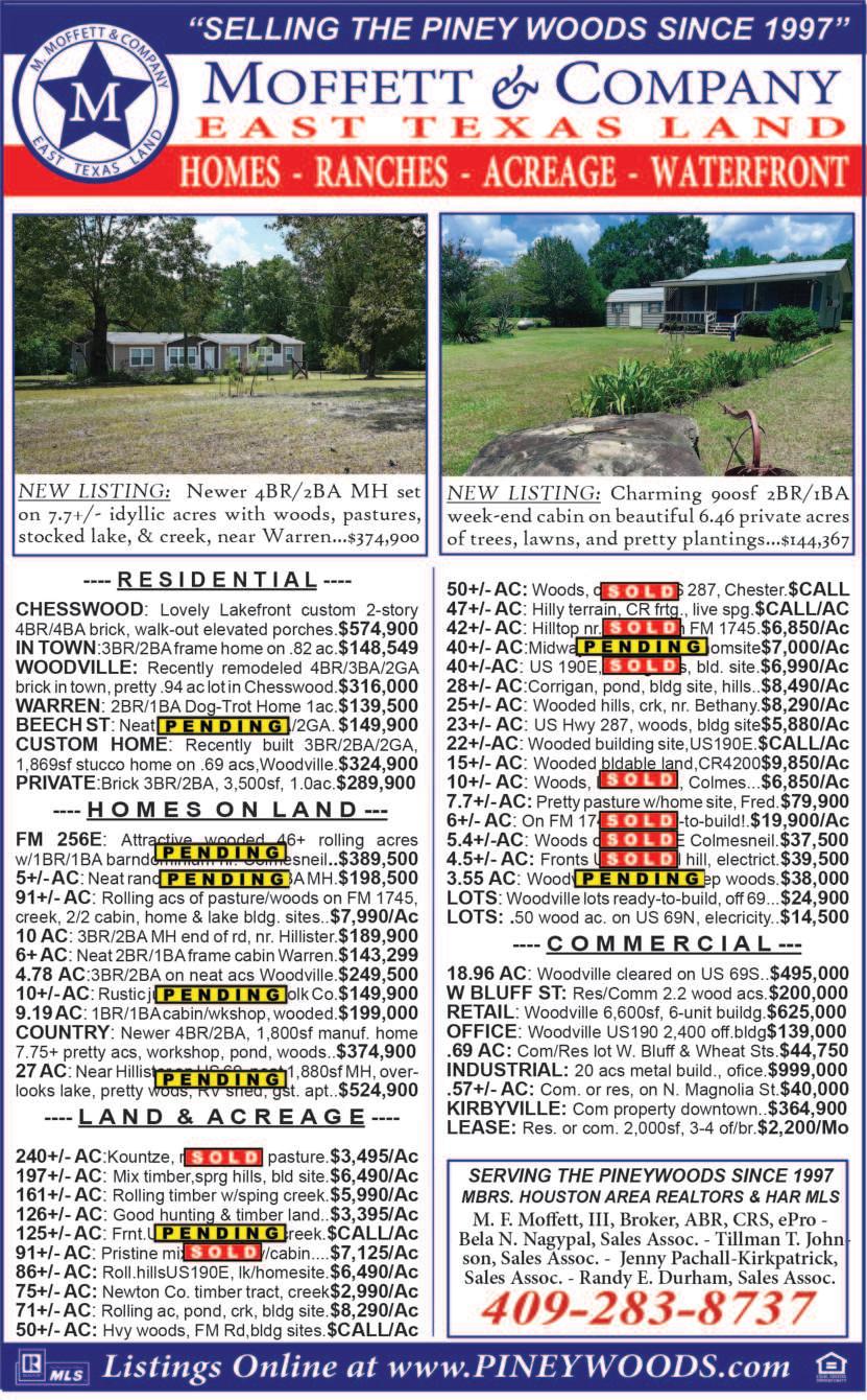 CMYK Page 8B | TYLER COUNTY BOOSTER | Thursday, August 25, 2022 easttexasnews.com Tyler County: Real Estate Listings Hometown people you can trust. 907 W Bluff St • Woodville, TX 75979 907 W. Bluff St. • TX 75979 fowler1st.com 409.331.9636 Members of the Houston Association of Realtors, Southeast Texas MLS, TAR MLS Welcome to this world! to this world! Office: (409) 283-3110 Cell: (409) 429-4262 Jim Rawson, Broker • Andrea Ayers, Agent 7 Miles South of Woodville On Hwy 69 Open Thursday-Monday 9 am - 4 pm • Open Weekends CHARLES RAWSON CO. REAL ESTATE www.charlesrawsonrealestate.com NEAT BRICK, short walk to Ski Lake, 2 bed, 1 bath, Great sunroom, Ch/A, Fireplace, Detached carport/work shop, Engamore ...................................................................................................................................................$127,000 RANCHETTE, Approx 3.56 acres. Galahad Loop ............................................................................................$40,000 HOMES ONLY 3 lots, septic, water, electric, storage, Ivanhoe West ....................................................$35,000 SKI LAKE BRICK CHALET, 3-2,open plan,CH/A,woo fire place,fenced & wooded half acre,concrete bulkhead,neat pergula,
