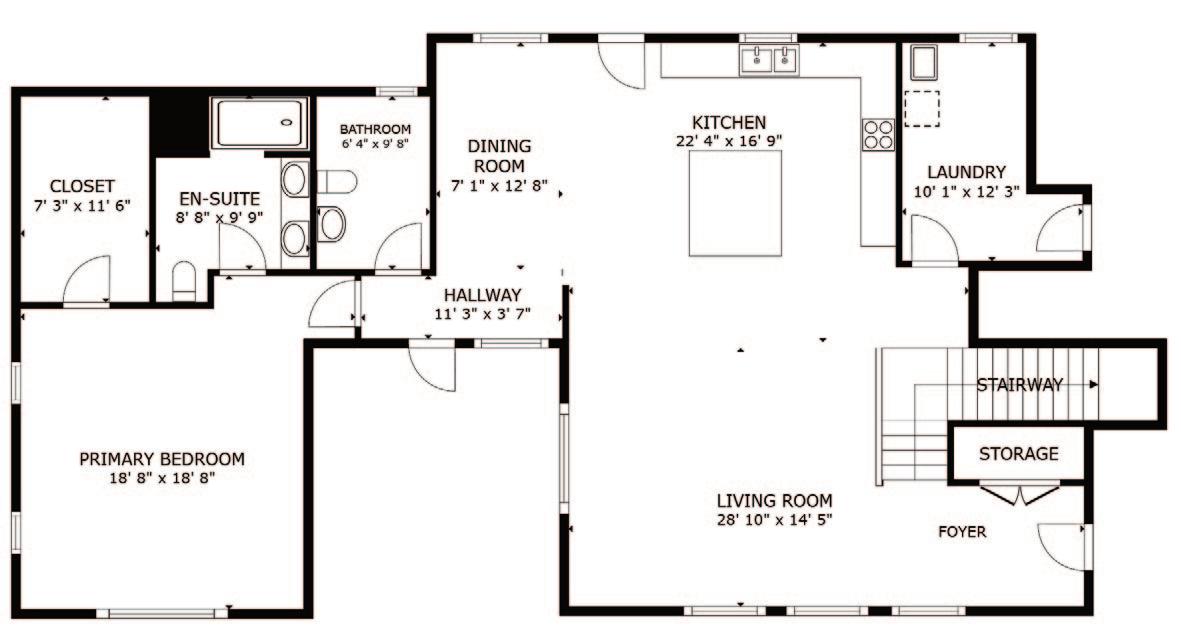 Kitchen island, stainless steel appliances, carpet/tile flooring, walk-in closet and ensuite in primary suite