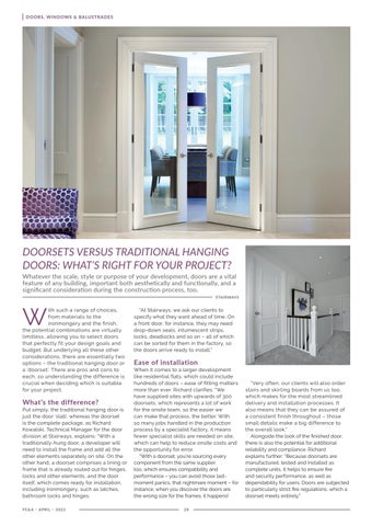 “Very often, our clients will also order stairs and skirting boards from us too, which makes for the most streamlined delivery and installation processes. It also means that they can be assured of a consistent finish throughout – those small details make a big difference to the overall look.” Alongside the look ofthe ßnished door, there is also the potential for additional reliability and compliance. Richard explains further: “Because doorsets are manufactured, tested and installed as complete units, it helps to ensure ßre and security performance, as well as dependability for users. Doors are subjected to particularlystrict ßre regulations,whi doorset meets entirely.”
