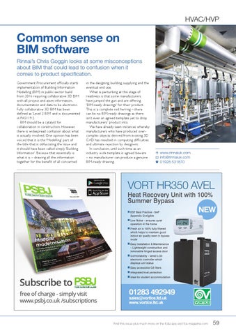 Common sense on BIM software Rinnai’s Chris Goggin looks at some misconceptions about BIM that could lead to confusion when it comes to product specification. Government Procurement officially starts implementation of Building Information Modelling (BIM) in public sector build from 2016 requiring collaborative 3D BIM with all project and asset information, documentation and data to be electronic. Fully collaborative 3D BIM has been defined as ‘Level 2 BIM’ and is documented in PAS119:2. BIM should be a catalyst for collaboration in construction. However, there is widespread confusion about what is actually involved. One opinion has been voiced that it is the ‘Modelling’ part of the title that is obfuscating the issue and it should have been called simply ‘Building Information’. Because that essentially is what it is – drawing all the information together for the benefit of all concerned