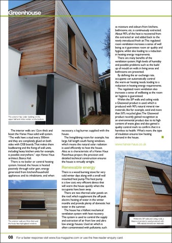as moisture and odours from kitchens, bathrooms, etc, is continuously extracted. About 90% of the heat is recovered from this extracted air and added back to the newly introduced fresh air.This regulated room ventilation increases a sense of well being, as it guarantees room air quality and hygiene, whilst also leading to a reduction in heating energy requirements. There are many benefits of the ventilation system. High levels of humidity and possible problems such as the build up of mould on walls in living areas and bathrooms are prevented. By defining the air exchange rate, occupants can automatically control the warm-air heating needs, leading to a reduction in heating energy requirements. The regulated room ventilation also increases a sense of wellbeing as the room air hygiene is guaranteed. Within the SIP walls and ceiling voids a Glasswool product is used, which is produced with 90% natural mineral raw materials, like for example, sand and more than 50% recycled glass.The Glasswool product recently gained recognition as an environmental product due to its high content of waste glass and also gained a quality control mark to confirm that it is harmless to health. What’s more, the type of insulation ensures low heating demand in the house.