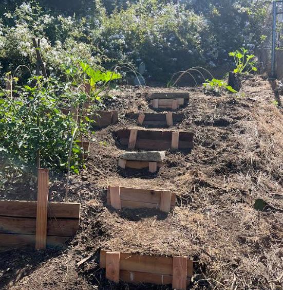 The site was sloped and covered in English ivy and periwinkle. Weeding, terracing, and mulching began before planting. All vegetables and herbs were grown from seeds. Encelia Californica was propagated from the local park in early summer and planted months later.