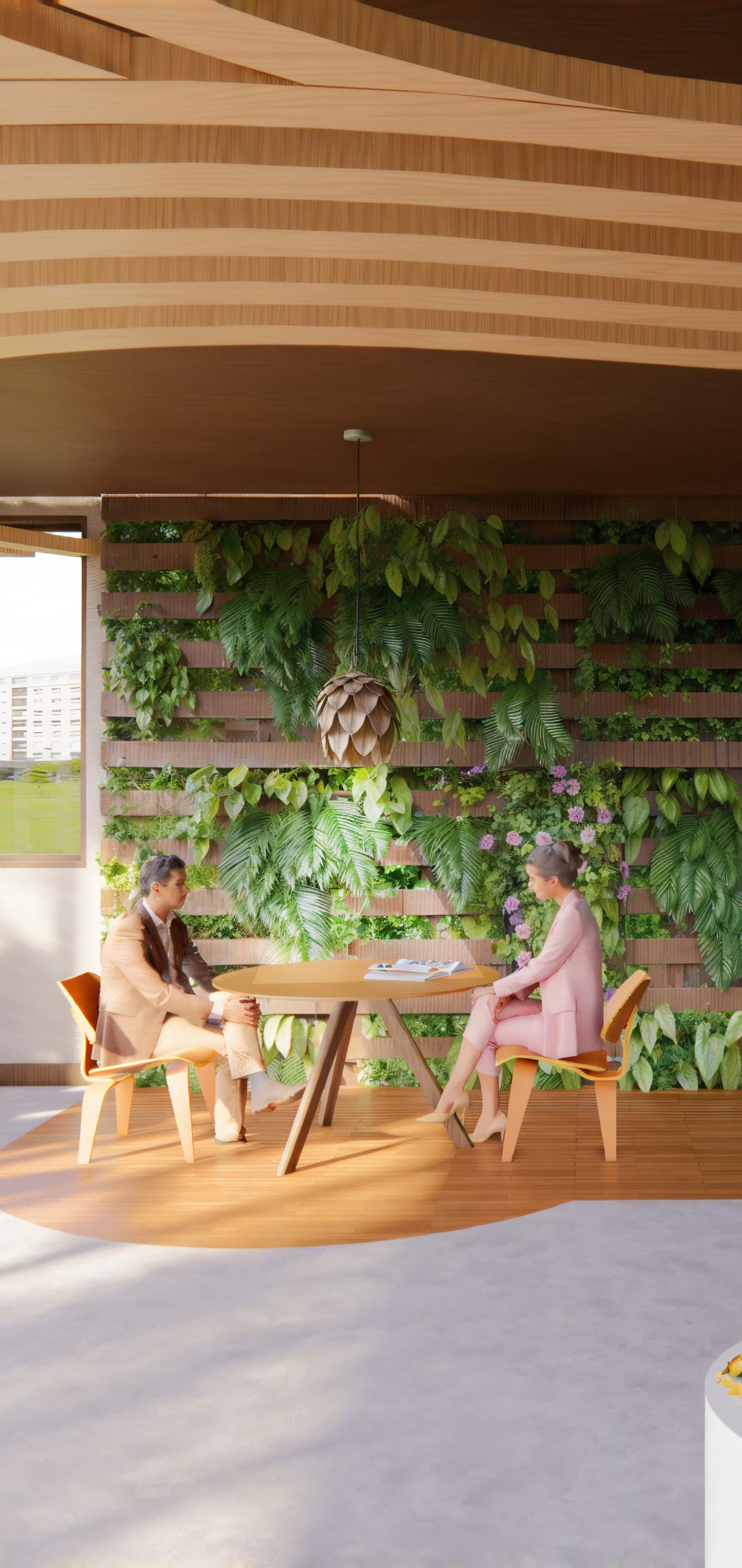 Bio-concrete is used throughout the outdoor space, fostering that connection to nature while maintaining structural integrity. Most of the wood is a product of bamboo, to maintain sustainable practices.