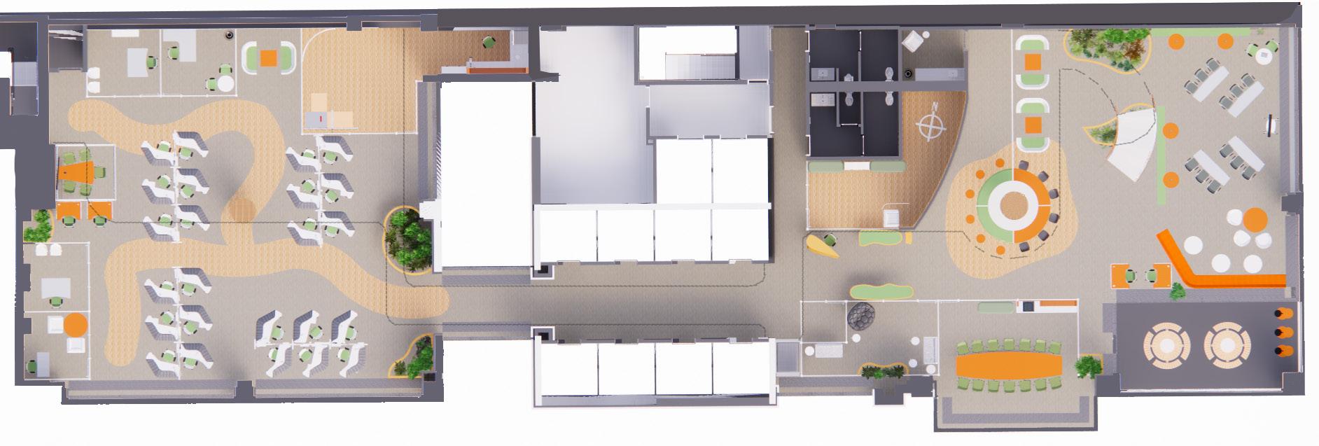 Various biophilic methods were used throughout the space- such as the Flow Lighting, which follows movement throughout the space, including exits. This leads to more energy conservation and a feeling of a living space.