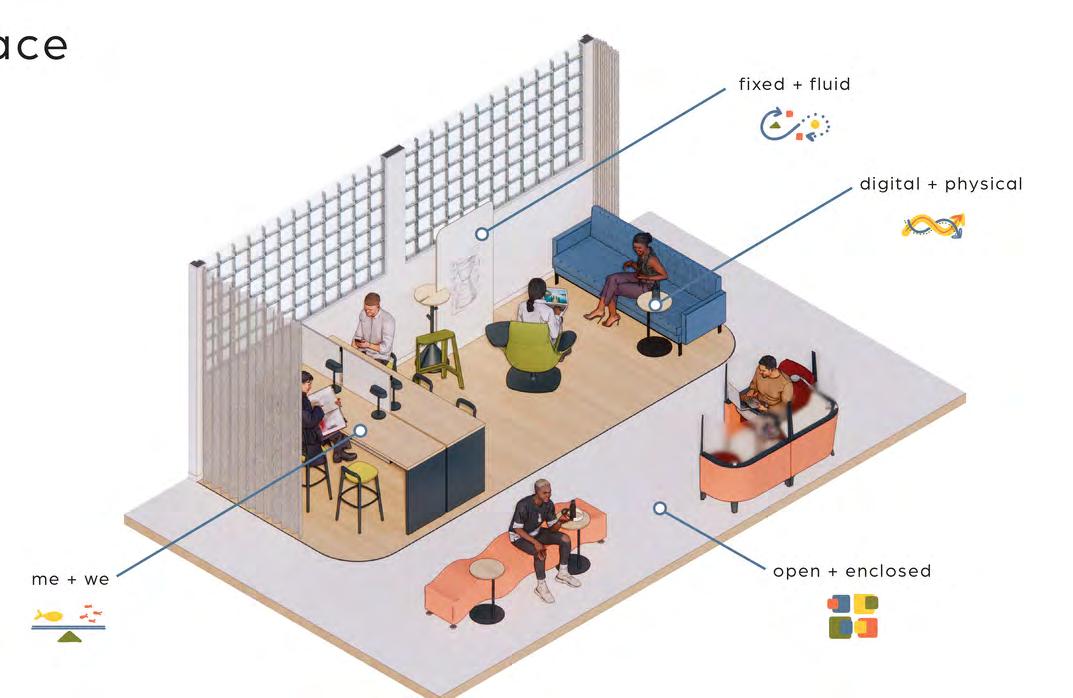 The ocean contains more than 1 million forms of marine life, each with unique and ever-changing needs, preferences and routines. These creatures move between different habitats to accommodate the shifts in needs, traveling from high activity areas to still and sheltered zones. Next takes inspiration from the various ecosystems within the ocean to create environments suited for each individual’s needs. By providing this level of choice and control, Next creates a comfortable,invitingofficethatattractspeoplefromallbackgrounds tobecomeavibrantanddiverseseaofplenty.