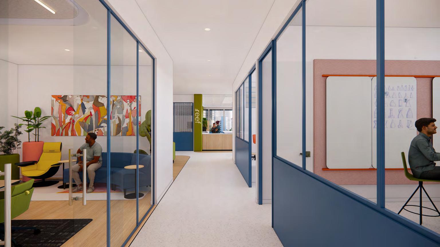 Corridorsofinnovationandcollaborationlinethewingsoftheoffice, becomingakeypartofeveryemployee’scirculationpath.Bywalking past these spaces, employees are invited to look or step in to these collaborative + learning spaces to stay involved in Next’s projects in everydepartment.