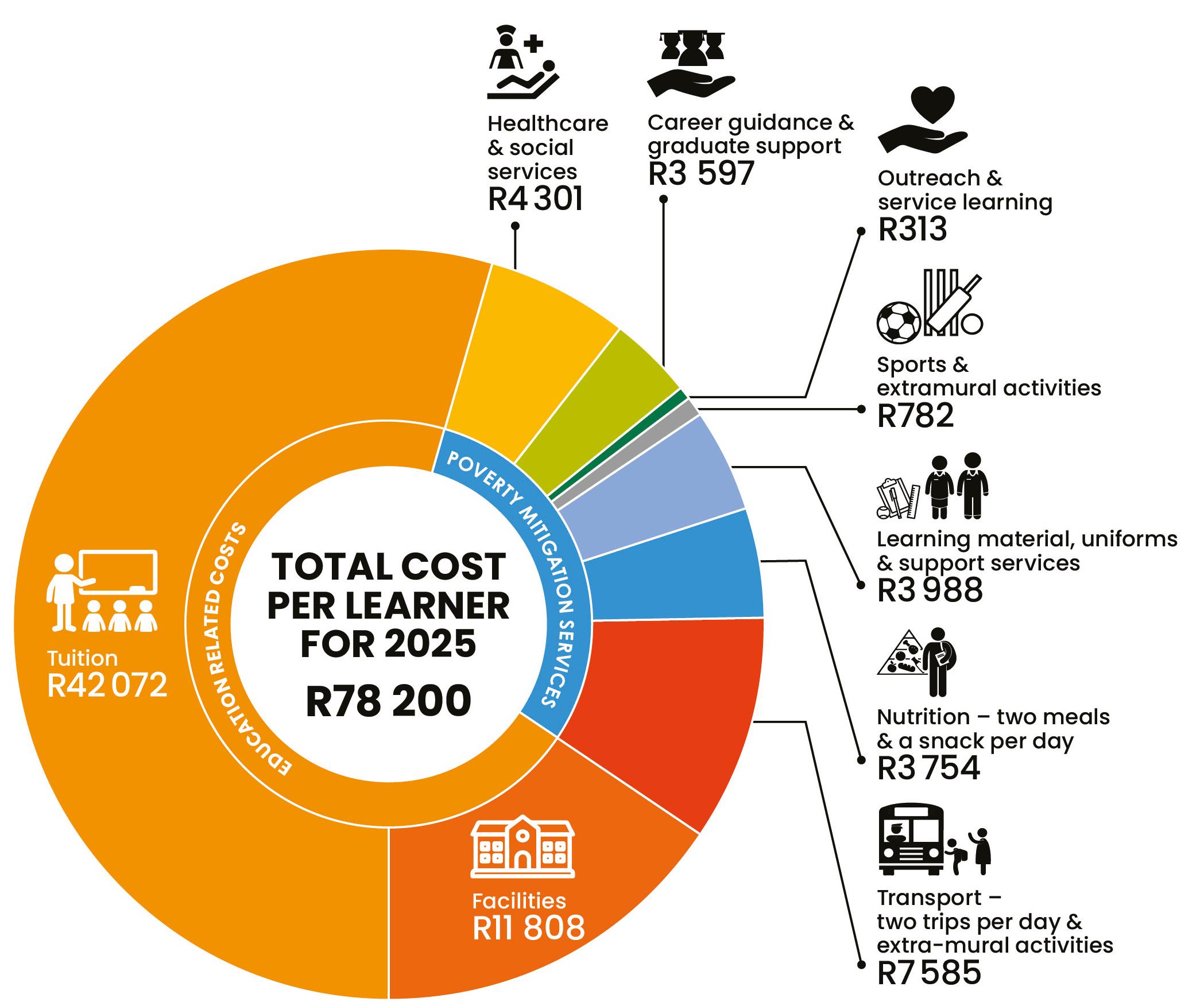 development, nutrition in schools, a broad curriculum, extensive counselling and support for the leaners, and uncompromising focus on the quality of our teachers and their tools of the trade.