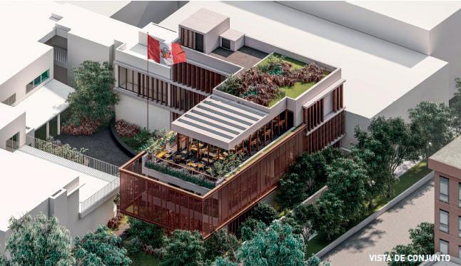 El proyecto aspira a mostrar una fachada de la Diplomacia del Perú hacia el mundo, con una implantación serena que inspire a ser introspectivos, respeto al pasado, sobriedad hacia el exterior, calidez hacia el interior y la mediación con lo nuevo. El proyecto utiliza al máximo el área dispuesta, y se trabaja la forma como un cuerpo prismático rectangular que sobresale con un vuelo de 50cm a partir del nivel 2. Esta extensión permite el desarrollo de una fachada de características permeables que protegen de la insolación y a su vez crean gestos a través de los cuales destacan vacíos por los cuales se ocupa con vegetación.