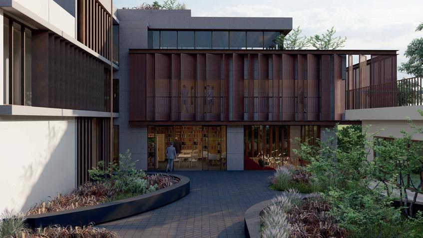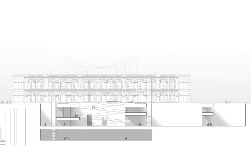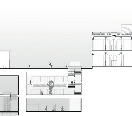 La plaza actúa como cubierta en el nivel -5,00 se ubica la sus servicios complementarios. can los archivos y las aulas plementarios. En el nivel -15 talleres, el patio y la zona complementarios. La estructura del conjunto los pisos son de madera y granito, riores son de vidrio.