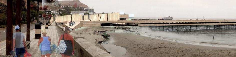 El malecón existente continua entre los actuales edificios aislados de los restaurantes, pero en esta oportunidad se transforma en estancias intersticiales (como restaurantes), que finalizan en un edificio longitudinal y compacto que contiene el programa cultural del conjunto.