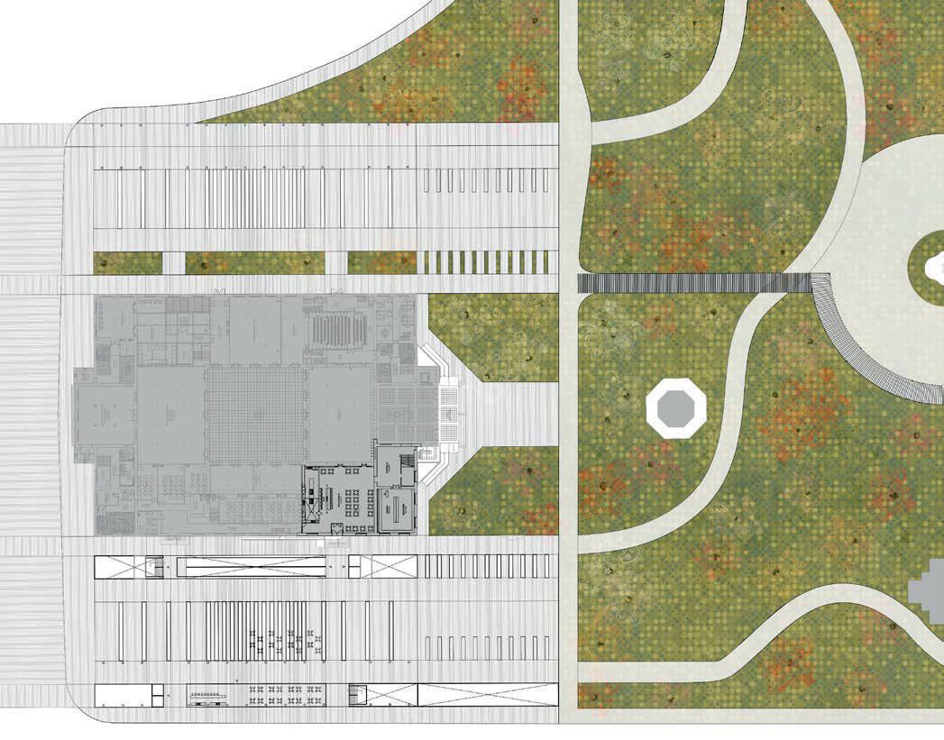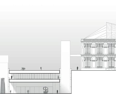 En el caso de la plaza oeste, concurso, se propone dos chada. La primera franja junto para iluminación y ventilación para conexiones verticales y la ampliación del museo franja junto a la Avenida Garcilazo bre con una pérgola, que sirve almacén, además incorpora rada del metro. Está pérgola calle y la plaza propuesta y dad a la plaza y actuar como paso de vehículos.