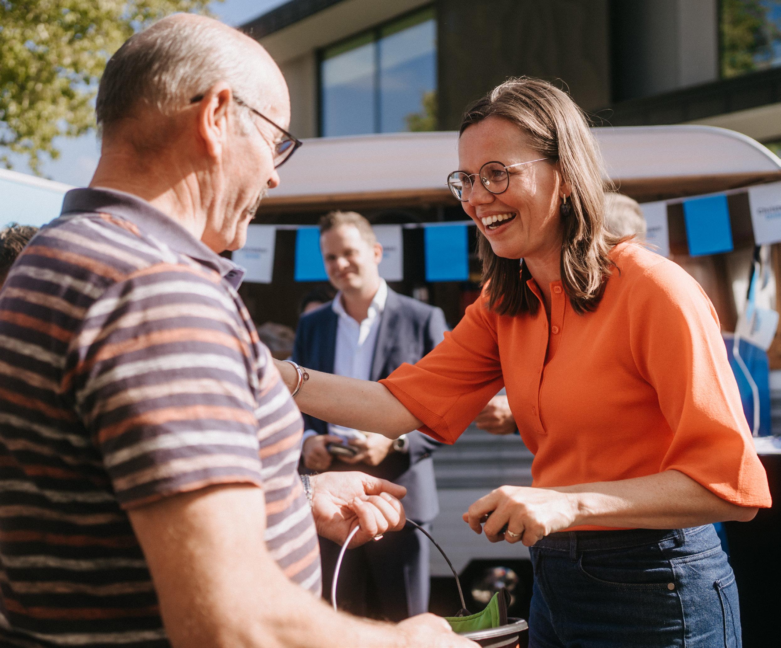 Mirjam: ‘Ik hou van campagnevoeren. Ik hou van mensen ontmoeten, naar hen luisteren en dat omzetten in actie. Maar ik hou ook van debatteren, over de verschillen tussen partijen en over wat er op het spel staat. En er staat veel op het spel deze verkiezingen: de woningnood, het gebrek aan vertrouwen in de politiek, vragen rond migratie. Al die zaken krijgen een gezicht in campagnetijd. Daarbij willen we voor de mensen die we ontmoeten pelgrims van hoop zijn. Ons niet neerleggen bij de donkere dingen die we zien, maar in beweging komen en licht brengen met onze visie voor Nederland.’