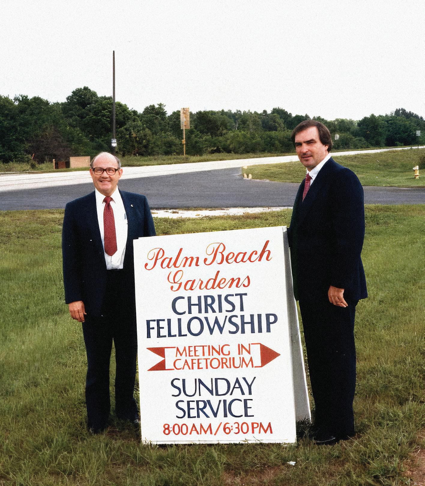 1984 - Después de que la sala de su casa se le quedó pequeña, el pastor Tom Mullins (a la derecha) se encuentra frente al primer letrero de la iglesia afuera de la Escuela Primaria Grove Park—los inicios de Christ Fellowship Church.