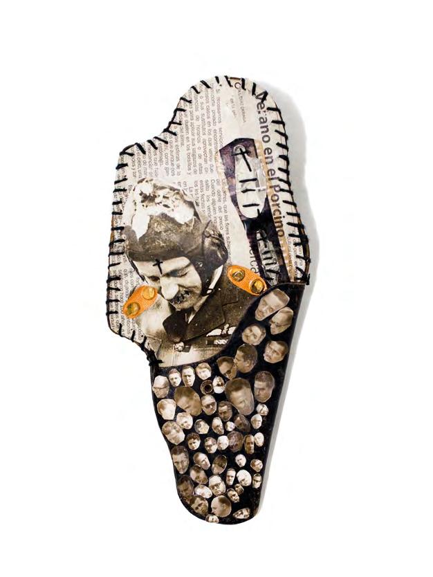 untitled, 2015, ink, collage an sewing on holster, 31.5 x 14.5 x 4 cm