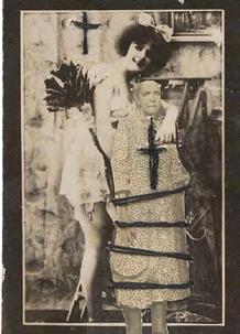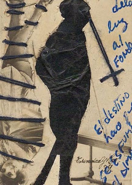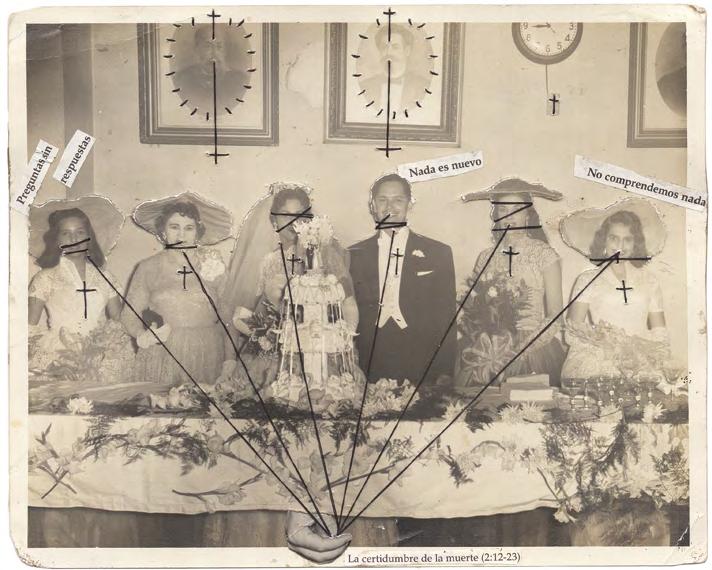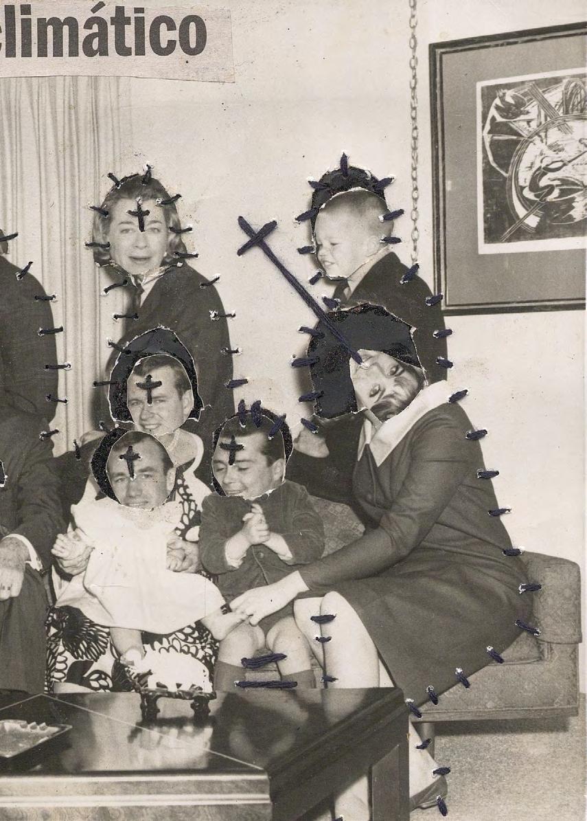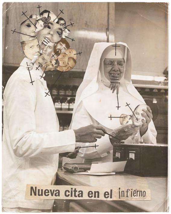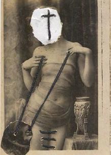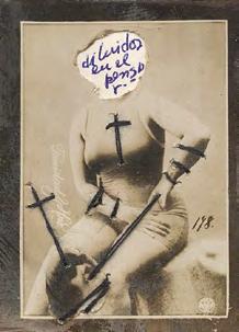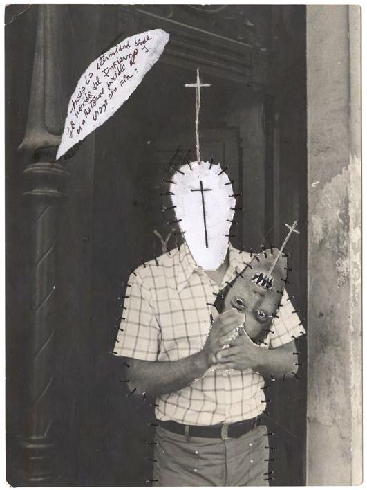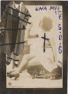 The erotic image is the most recent development in El Buzo’s retouched photographs. The female figure is almost always laced up, partially or totally; a call to bondage, to shibari. The cross hangs from hands that pinch, affixes third parties that bite, emerges from smiling, lascivious or absent faces. Sometimes this cross covers two breasts, sometimes it overshadows the scene. As if as a reminder.