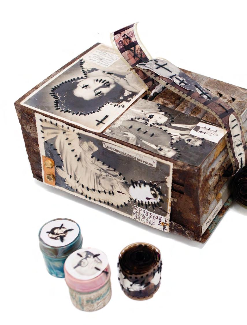 untitled, 2020, ink, collage, photography and sewing on box, 9 x 6.5 x 6.5 cm