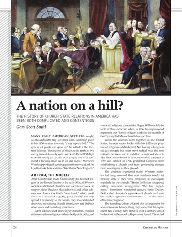 The hisTory of church-sTaTe relaTions in america has been boTh complicaTed and conTenTious. restricted religious competition. Roger Williams felt the Gary Scott Smith teeth of this restriction when, in 1636, his impassioned