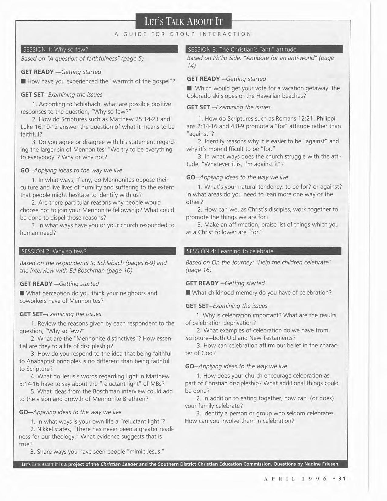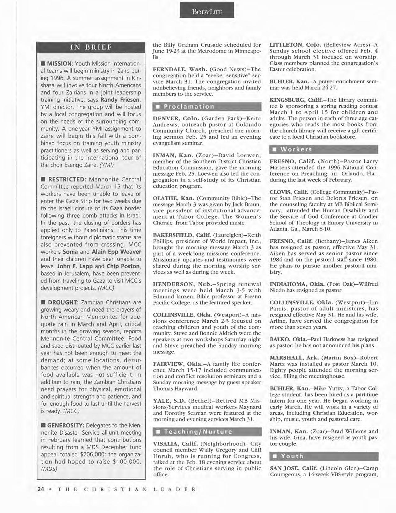 MANDATE: THE CHRISTIAN LEADER (ISSN 00095149), organ of the U.S. Conference of Mennonite Brethren Churches, is published monthly by the U.S. Conference Board of Communications, 315 S. Lincoln, Hillsboro, KS 67063. The Christian Leader seeks to inform Mennonite Brethren members and churches of the events, activities, decisions, and issues of their denomination, and to instruct, inspire and initiate dialog so that they will aspire to be faithful disciples of Christ as understood in the evangelicalj Anabaptist theological tradition.