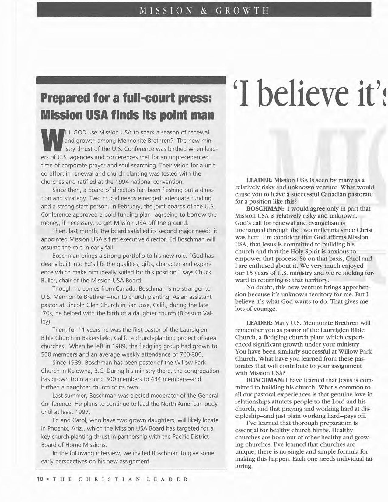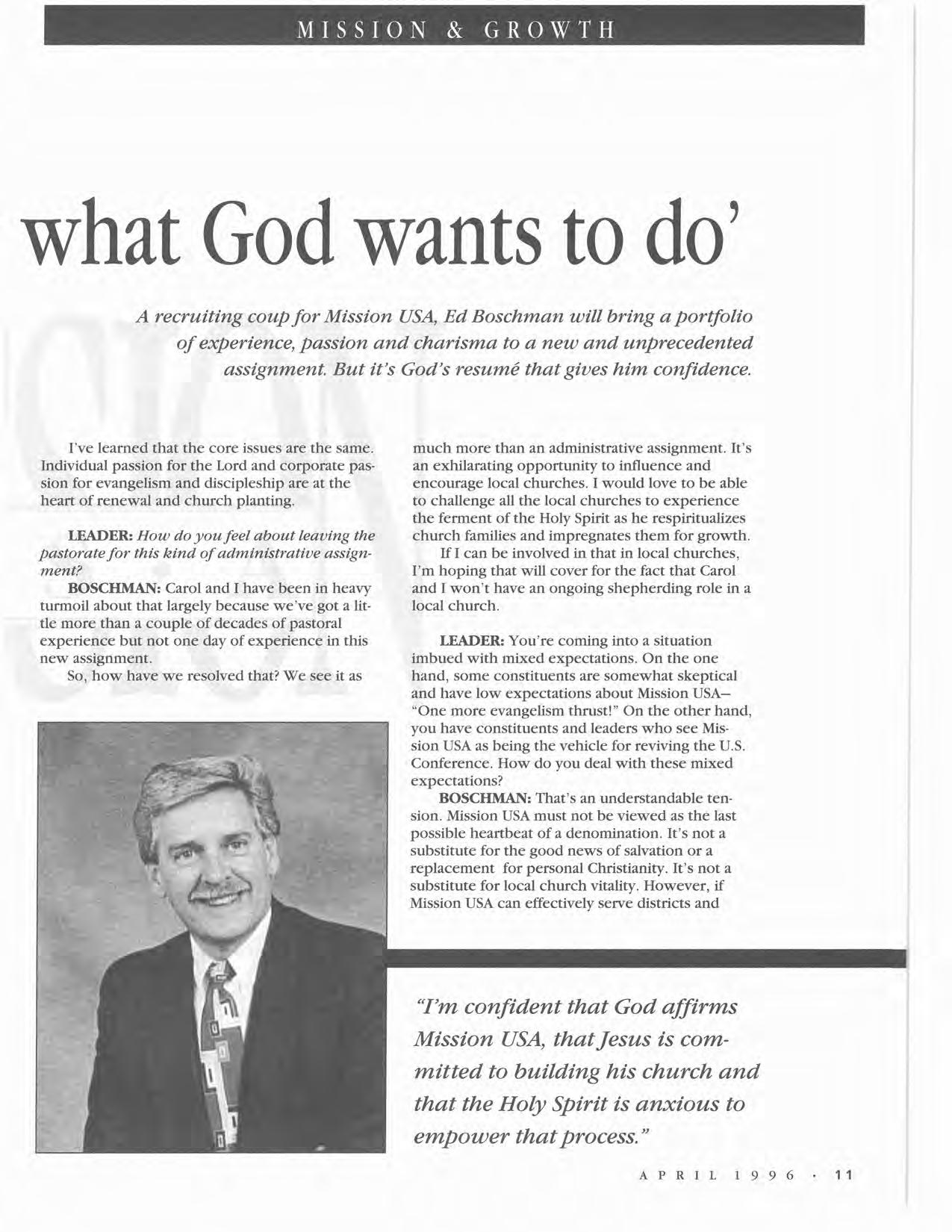 10 II believe itls what God wants to dol Mission USA will make a difference in our mission and growth, says Ed Boschman. Our interview with the newly selected Mission USA executive director will tell you why.