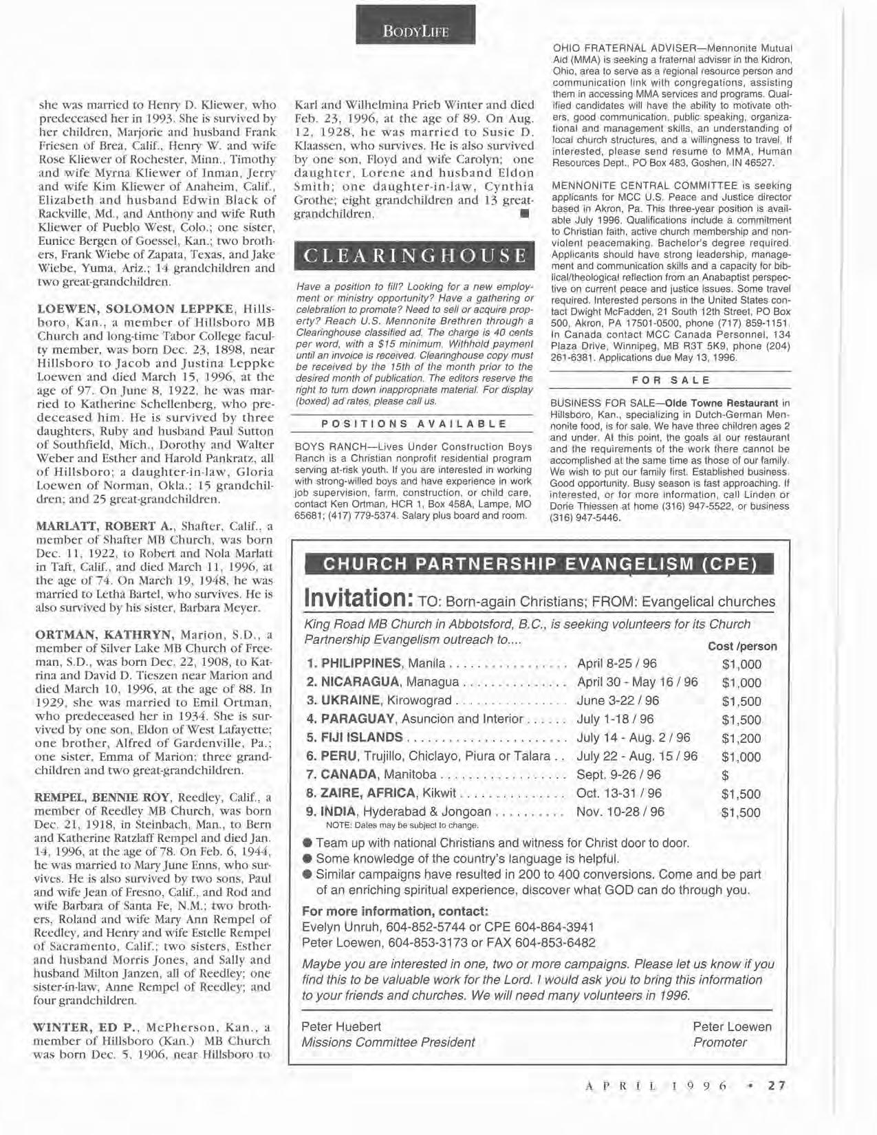 EDITORIAL POLICY: The views and opinions of our writers and advertisers are their own and do not necessarily represent the position of The Christian Leader, the Board of Communications or the Mennonite Brethren Church. The editors invite free-lance article submissions, but ask that each submission be accompanied with a SASE. The editors reserve the right to edit, condense or refuse all copy submitted for publication; anonymous contributions will not be published.