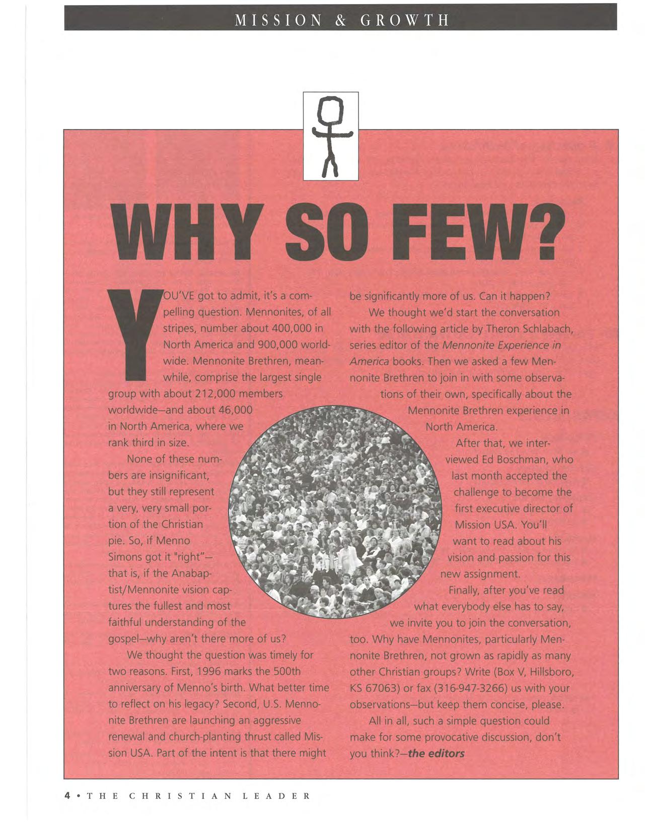 We thought the question was timely for two reasons. First, 1996 marks the SOOth anniversary of Menno's birth. What better time to reflect on his legacy? Second, U.S. Mennonite Brethren are launching an aggressive renewal and church-planting thrust called Mission USA Part of the intent is that there might