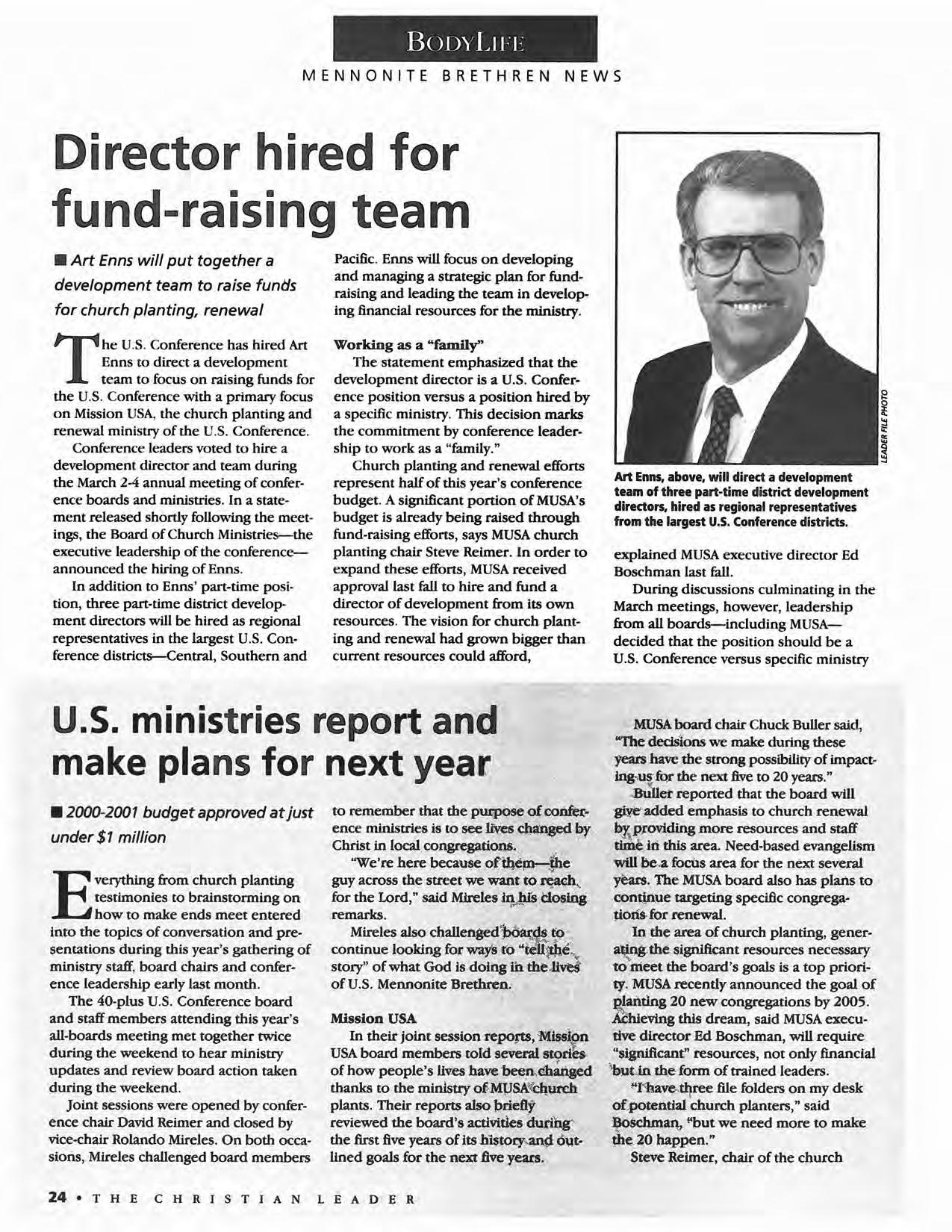 • Experience in marketing, sales, or fund raising. Direct Resumes and Inquires to: Attn: Arthur Enns Mission USA, 20165 N. 67th Ave. Suite 120, Glendale, AZ 85308; fax: 623-825-7135; phone: 623825-7112; e-mail: ebmusa@phnx.uswest.net