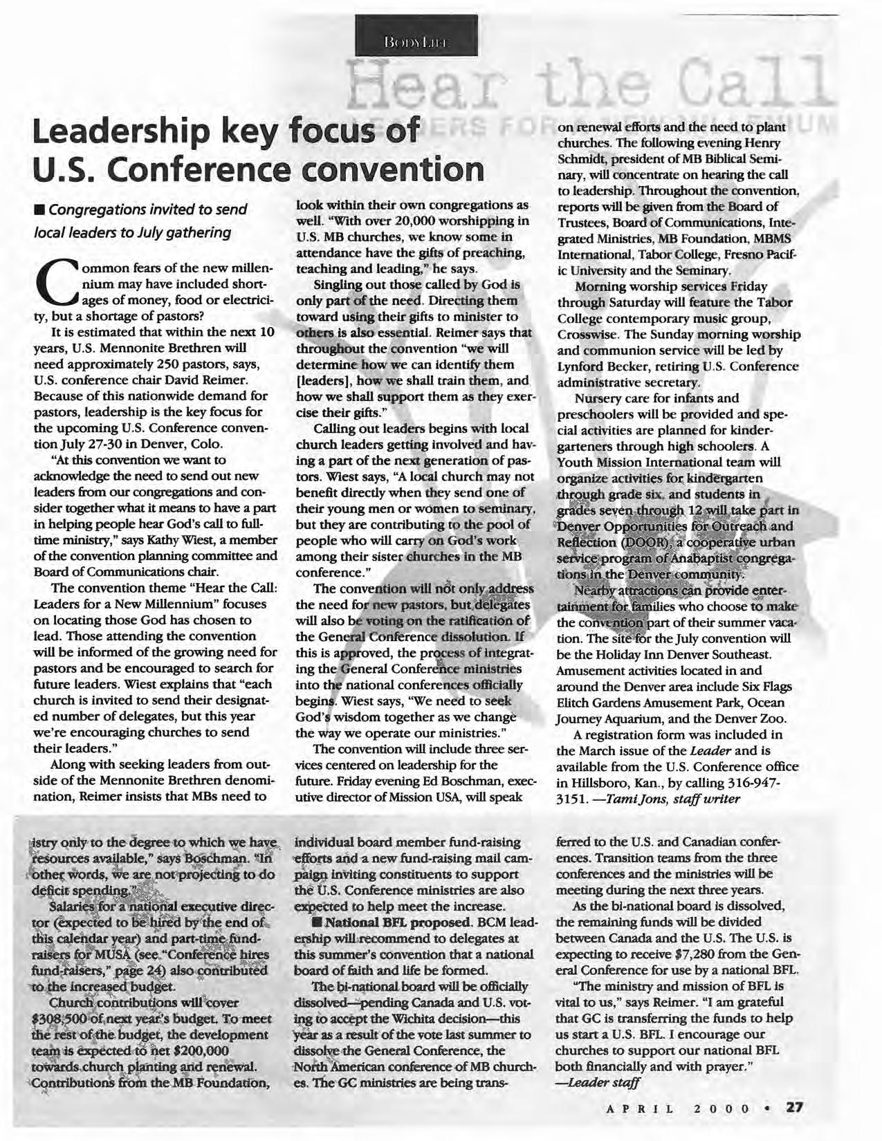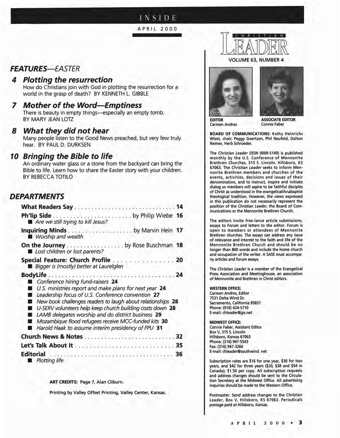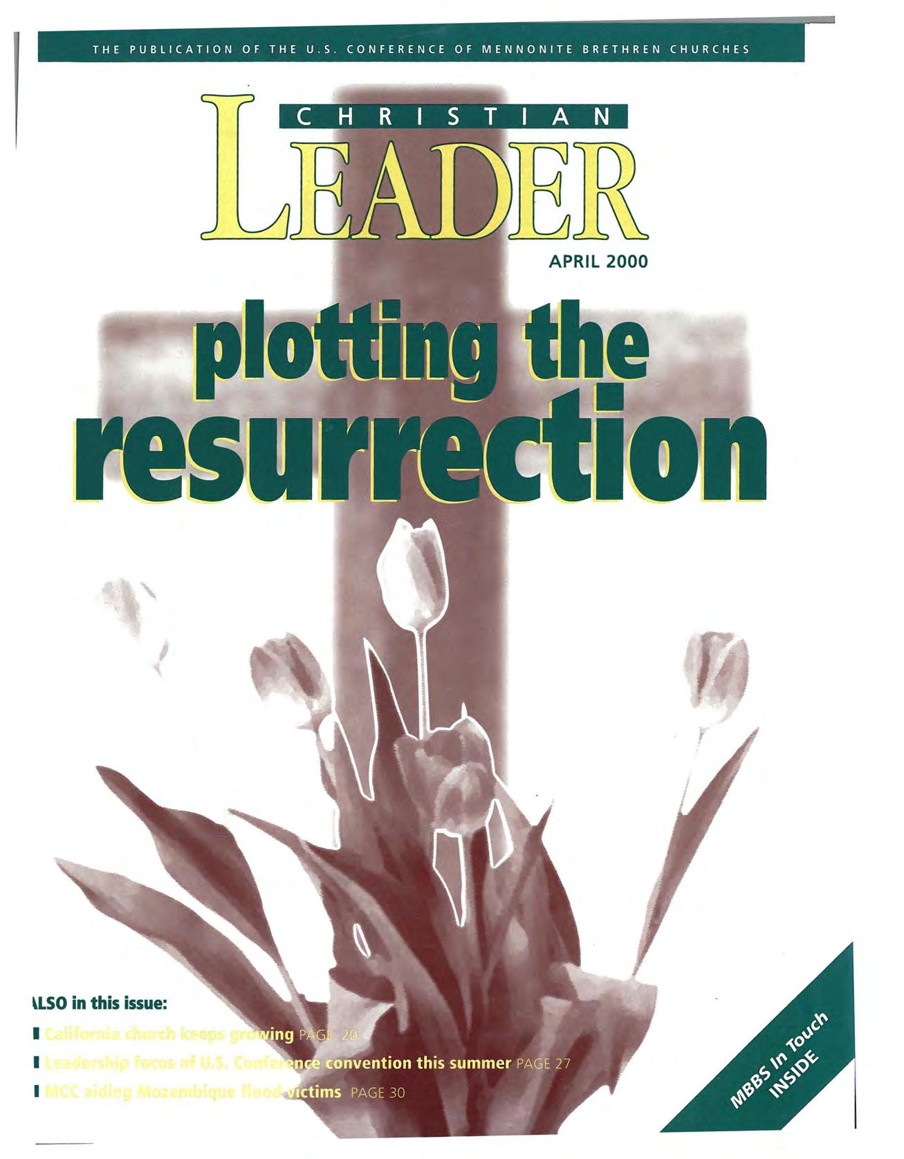 The Christian Leader (ISSN 0009-5149) is published monthly by the U.S. Conference of Mennonite Brethren Churches, 315 S. Lincoln, Hillsboro, KS 67063. The Christian Leader seeks to inform Mennonite Brethren members and churches of the events, activities, decisions and issues of their denomination, and to instruct, inspire and initiate dialog so members will aspire to be faithful disciples of Christ as understood in the evangelical/Anabaptist theological tradition. However, the views expressed in this publication do not necessarily represent the position of the Christian Leader, the Board of Communications or the Mennonite Brethren Church.