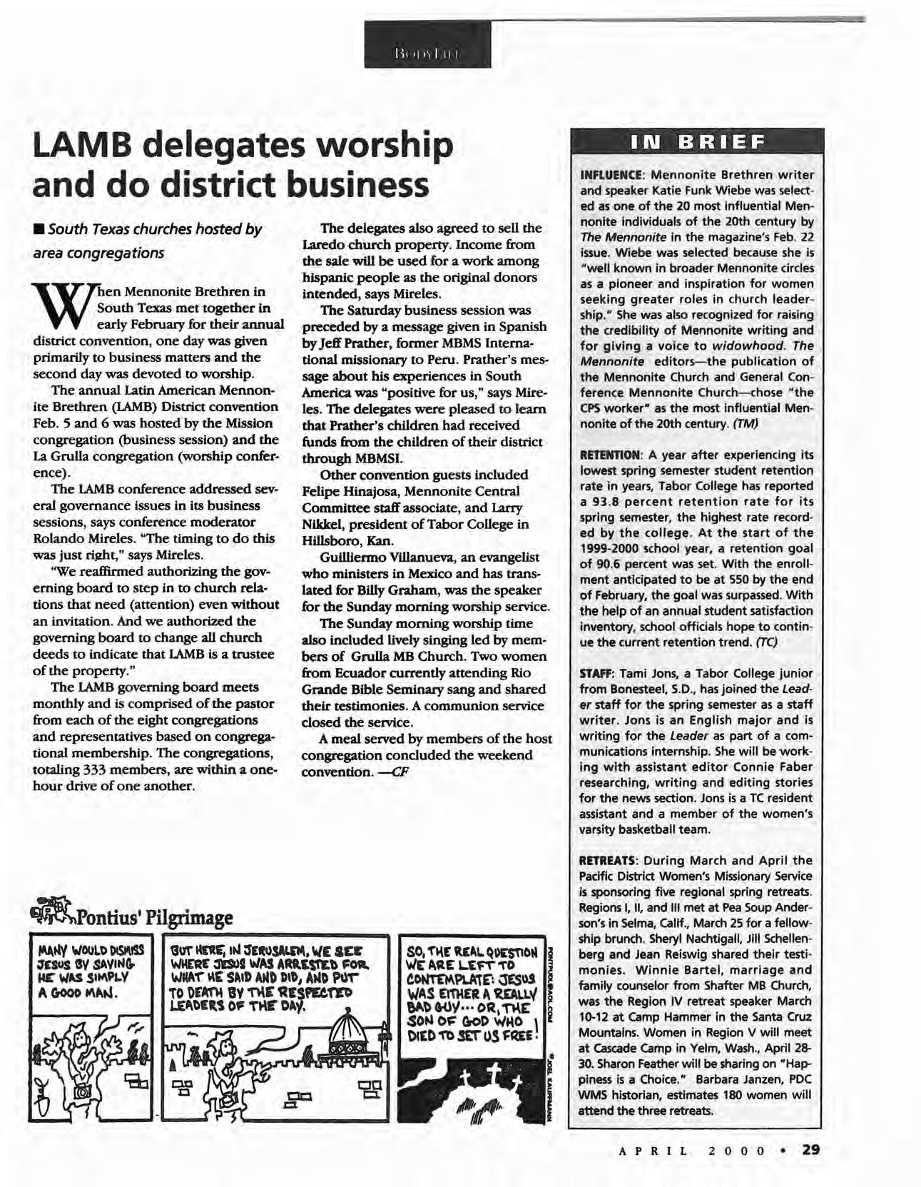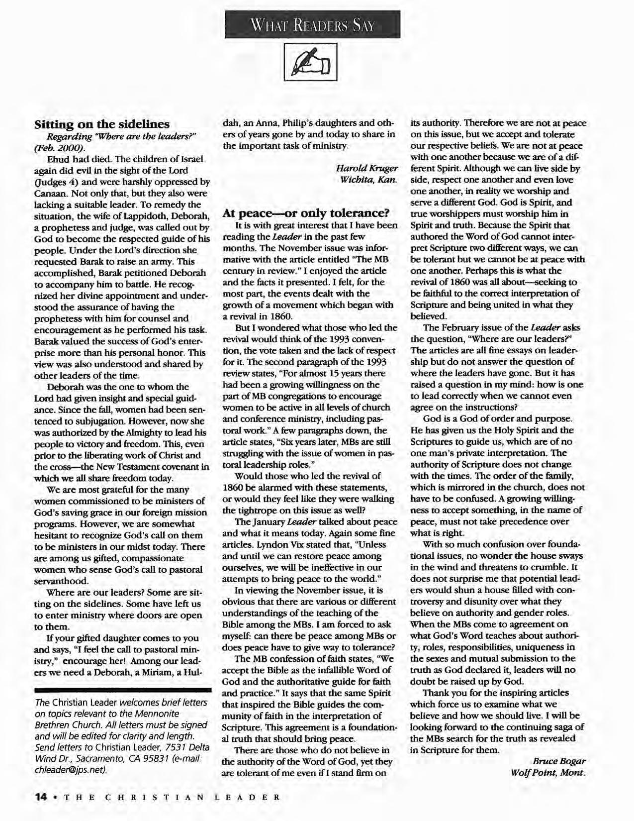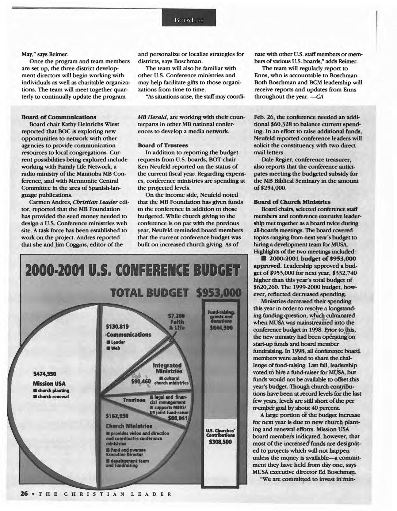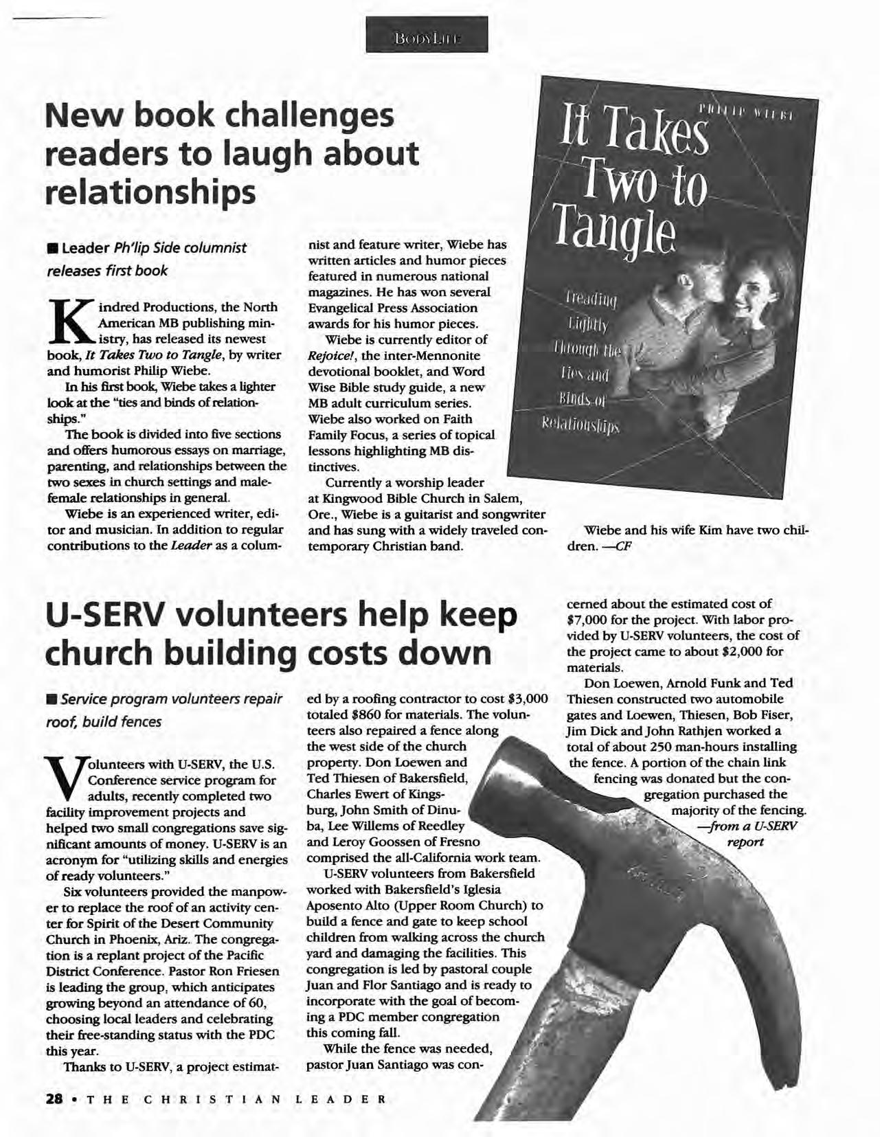 The Christian Leader (ISSN 0009-5149) is published monthly by the U.S. Conference of Mennonite Brethren Churches, 315 S. Lincoln, Hillsboro, KS 67063. The Christian Leader seeks to inform Mennonite Brethren members and churches of the events, activities, decisions and issues of their denomination, and to instruct, inspire and initiate dialog so members will aspire to be faithful disciples of Christ as understood in the evangelical/Anabaptist theological tradition. However, the views expressed in this publication do not necessarily represent the position of the Christian Leader, the Board of Communications or the Mennonite Brethren Church.