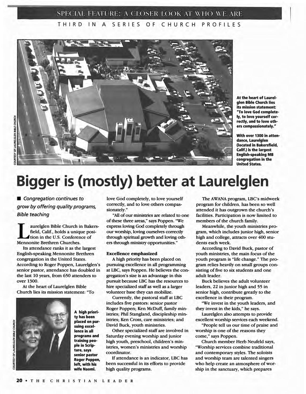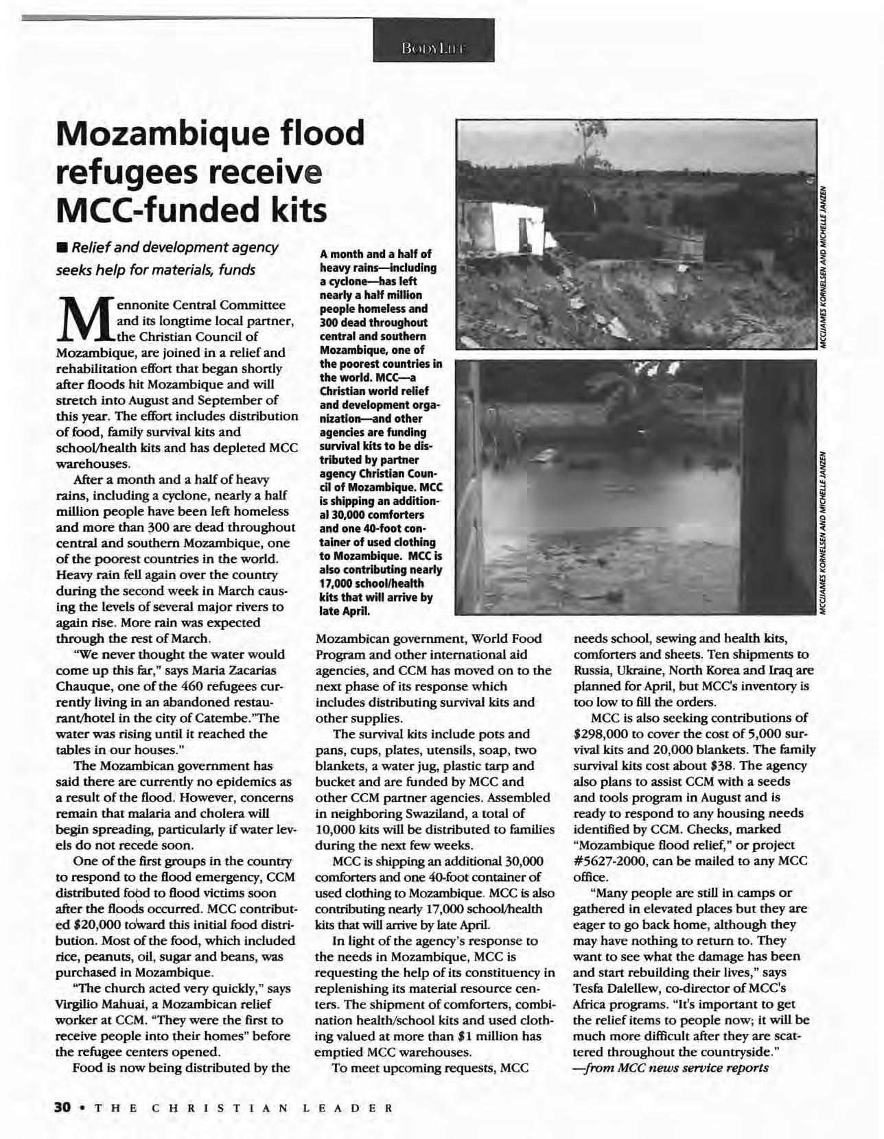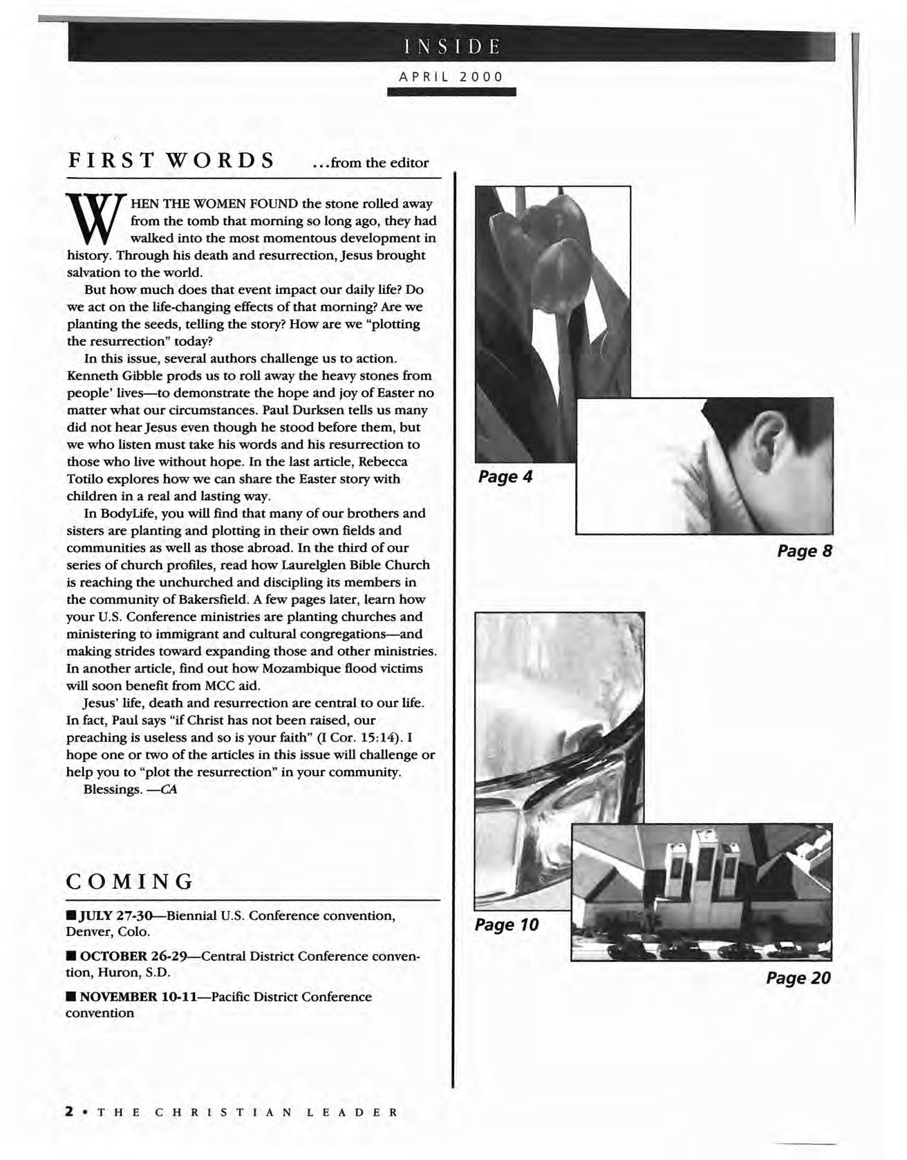 In BodyLife, you will find that many of our brothers and sisters are planting and plotting in their own fields and communities as well as those abroad. In the third of our series of church profiles, read how Laurelglen Bible Church is reaching the unchurched and discipling its members in the community of Bakersfield. A few pages later, learn how your U.s. Conference ministries are planting churches and ministering to immigrant and cultural congregations-and making strides toward expanding those and other ministries. In another article, find out how Mozambique flood victims will soon benefit from MCC aid.