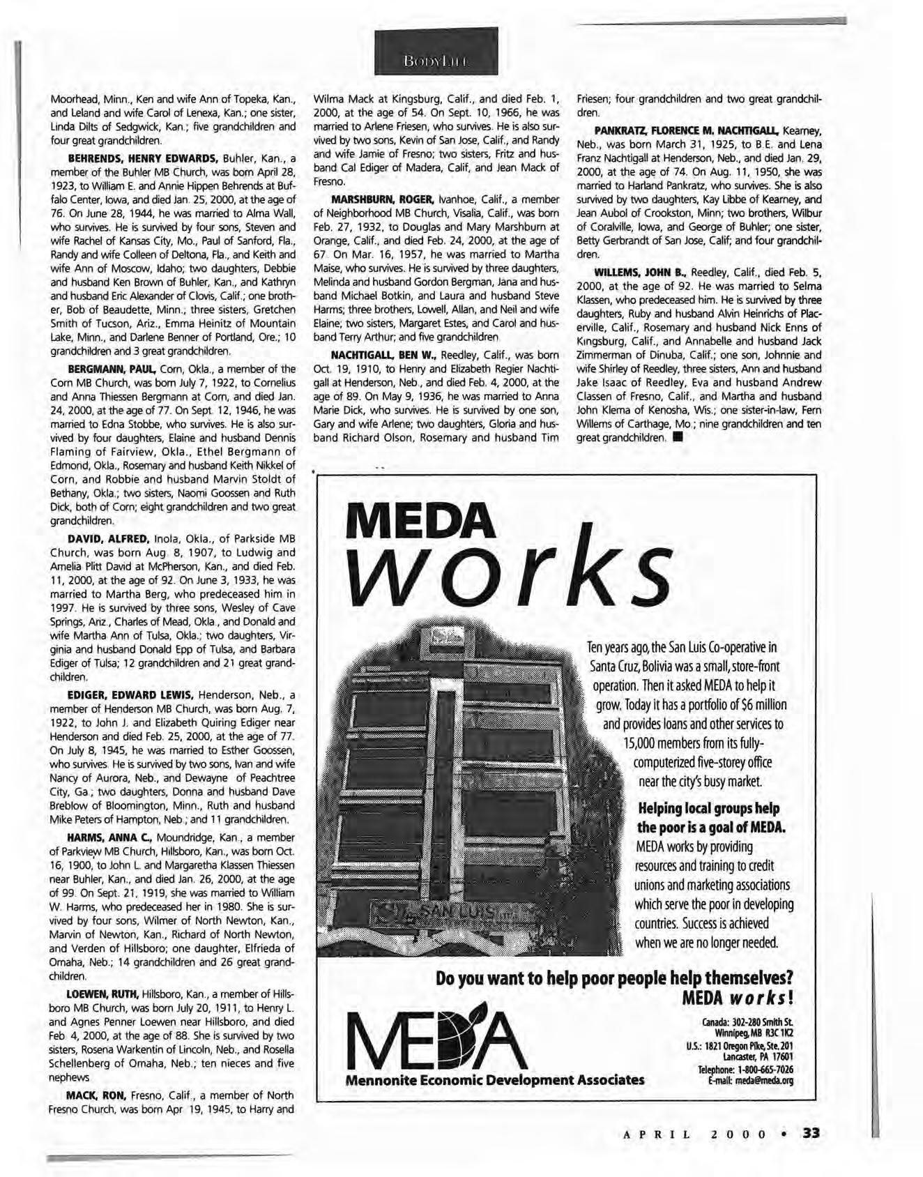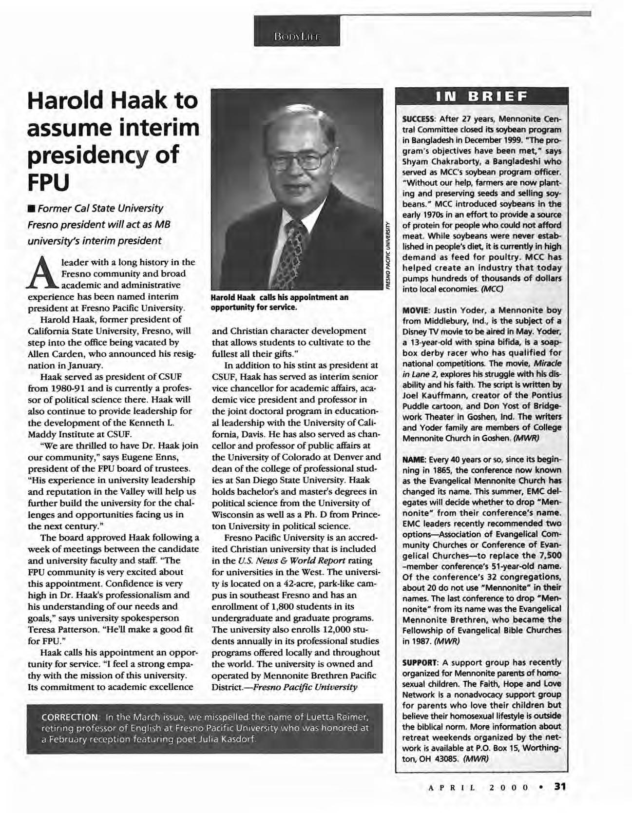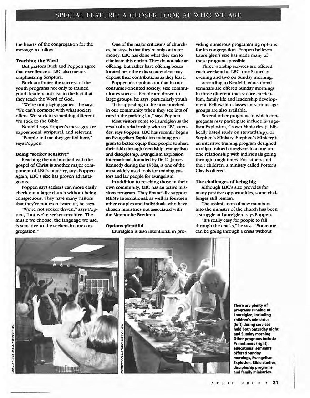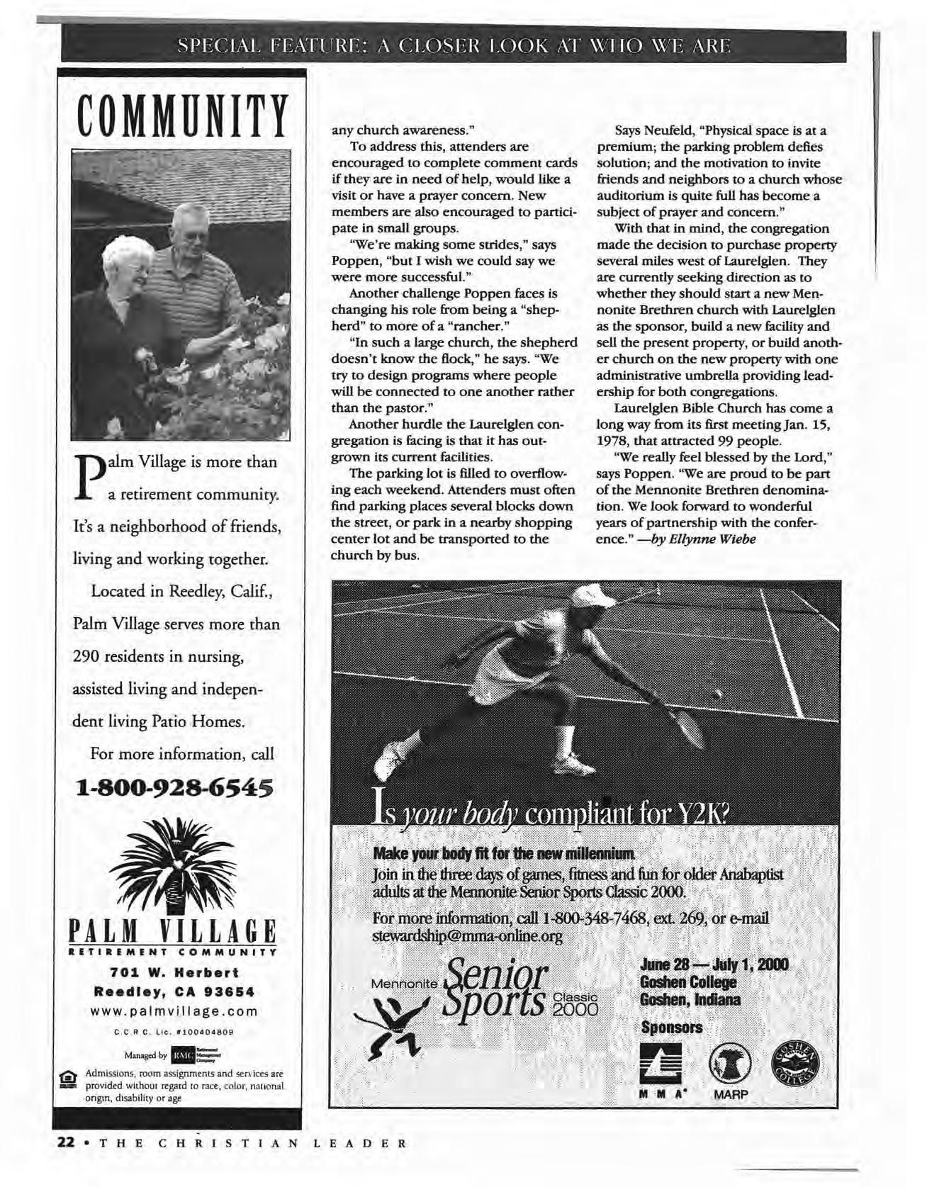 In BodyLife, you will find that many of our brothers and sisters are planting and plotting in their own fields and communities as well as those abroad. In the third of our series of church profiles, read how Laurelglen Bible Church is reaching the unchurched and discipling its members in the community of Bakersfield. A few pages later, learn how your U.s. Conference ministries are planting churches and ministering to immigrant and cultural congregations-and making strides toward expanding those and other ministries. In another article, find out how Mozambique flood victims will soon benefit from MCC aid.