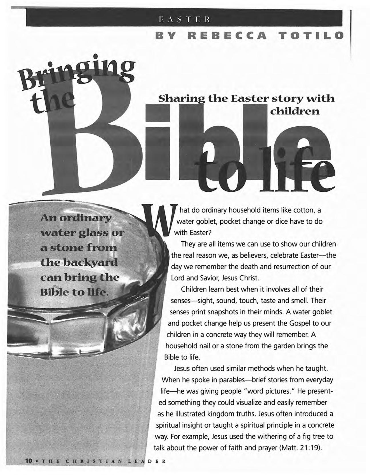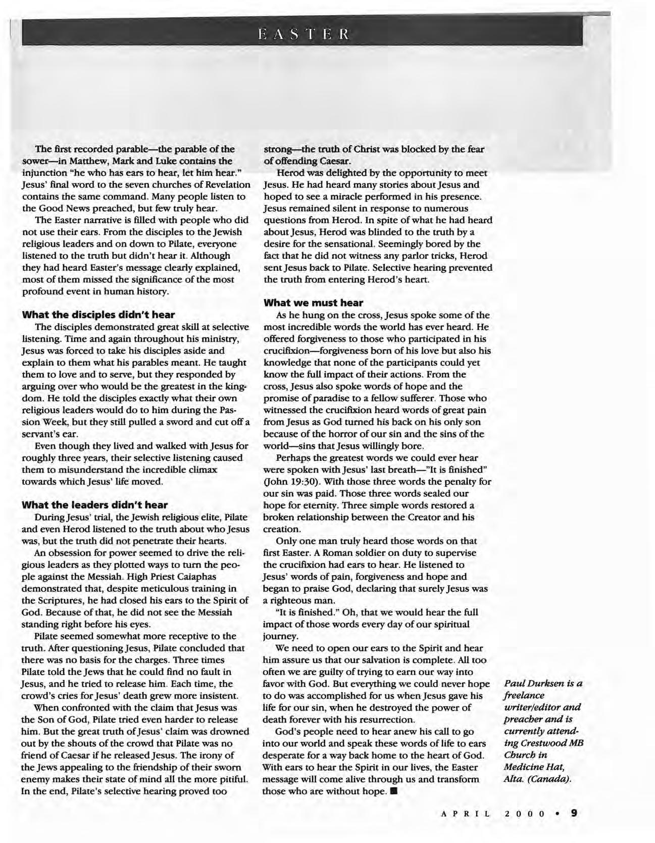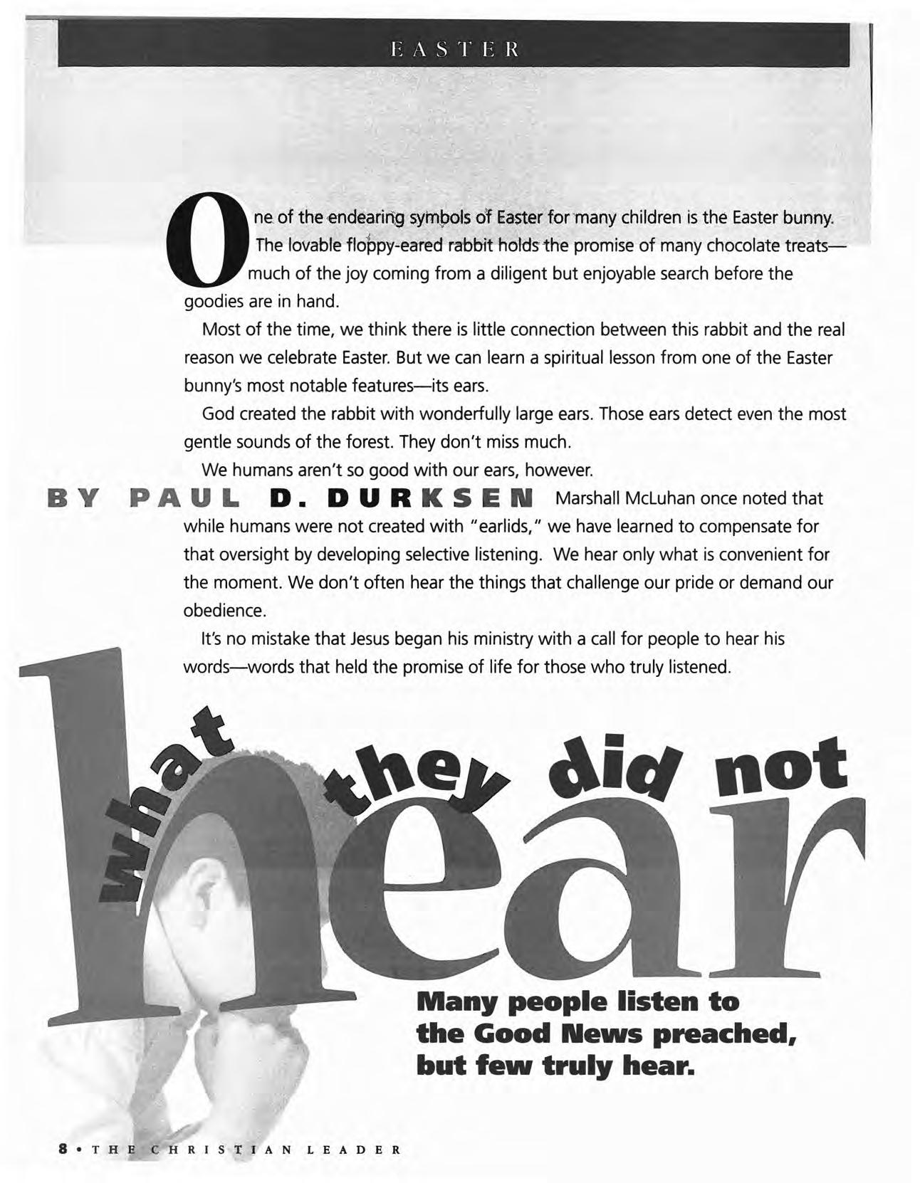 In this issue, several authors challenge us to action. Kenneth Gibble prods us to roll away the heavy stones from people' lives-to demonstrate the hope and joy of Easter no matter what our circumstances. Paul Durksen tells us many did not hear Jesus even though he stood before them, but we who listen must take his words and his resurrection to those who live without hope. In the last article, Rebecca Totilo explores how we can share the Easter story with children in a real and lasting way.