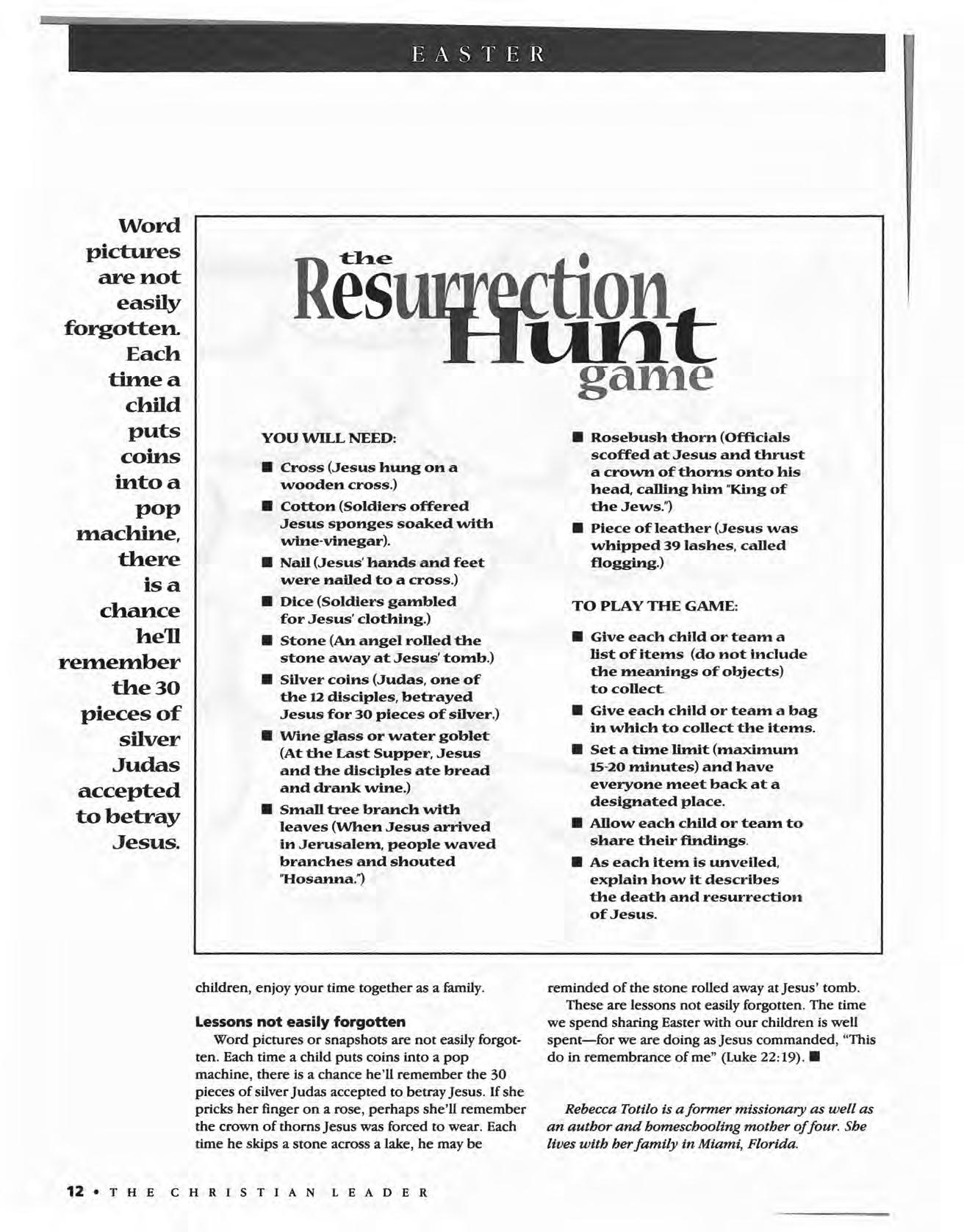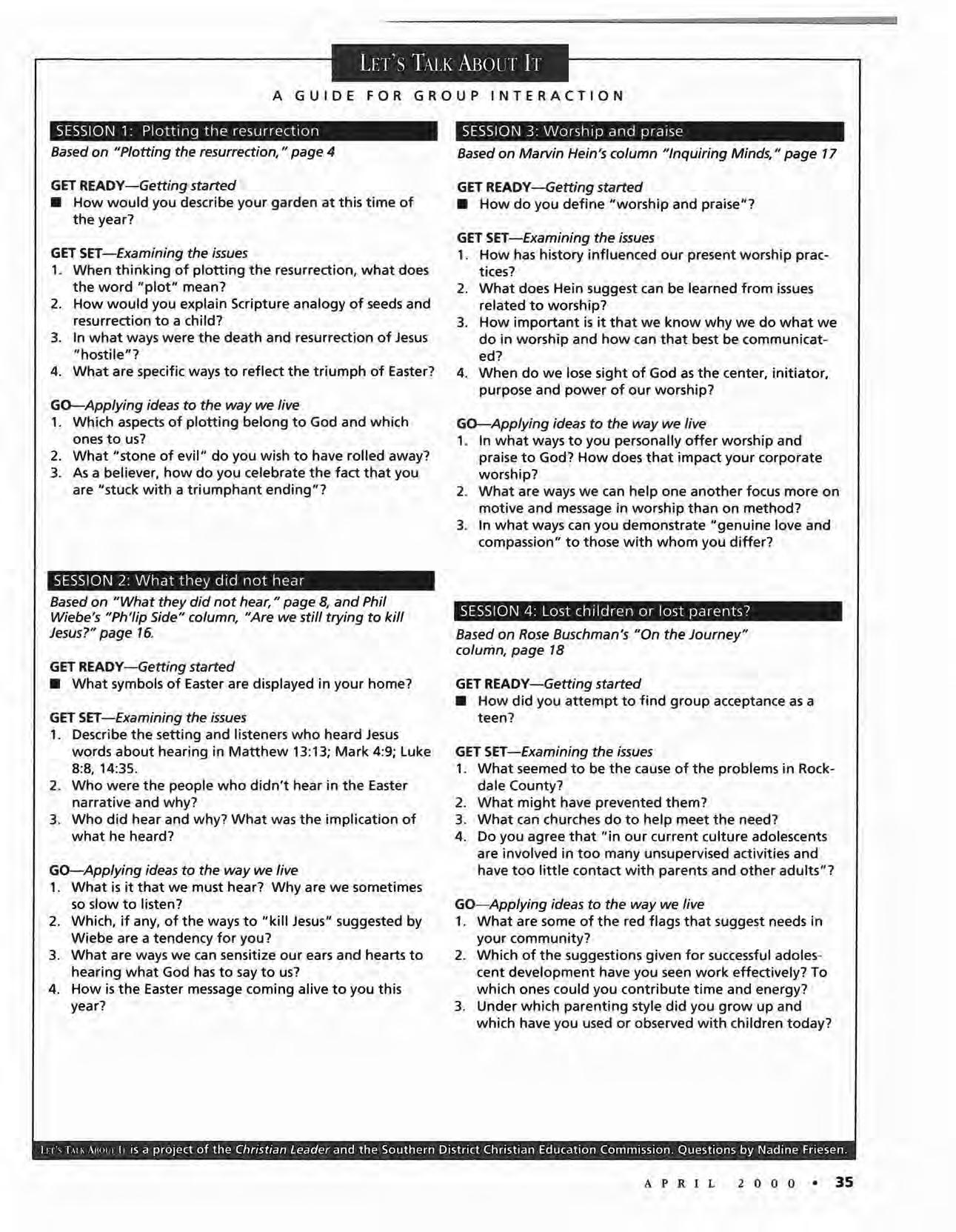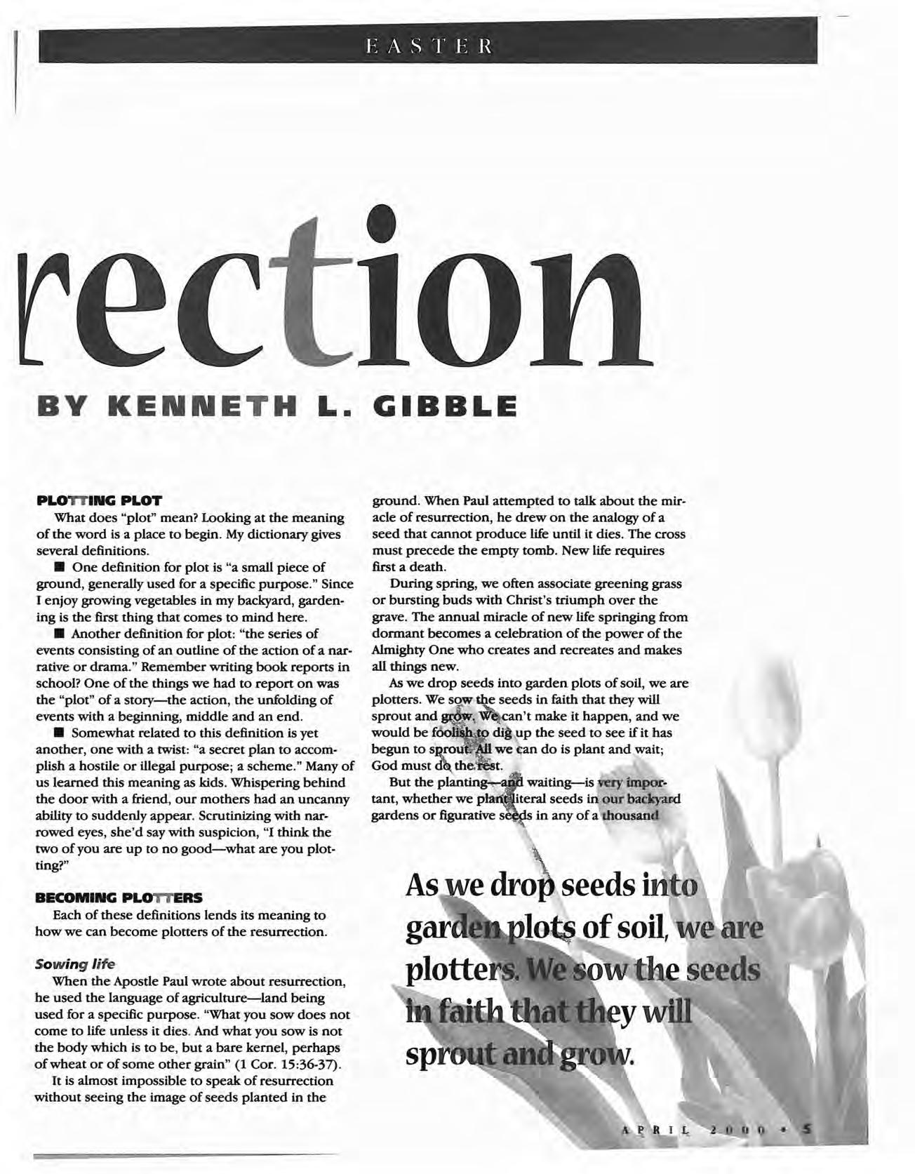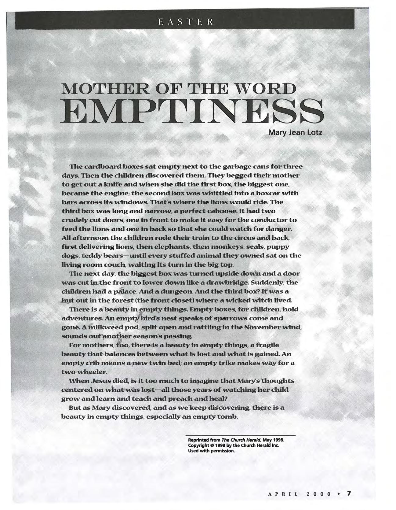 In this issue, several authors challenge us to action. Kenneth Gibble prods us to roll away the heavy stones from people' lives-to demonstrate the hope and joy of Easter no matter what our circumstances. Paul Durksen tells us many did not hear Jesus even though he stood before them, but we who listen must take his words and his resurrection to those who live without hope. In the last article, Rebecca Totilo explores how we can share the Easter story with children in a real and lasting way.