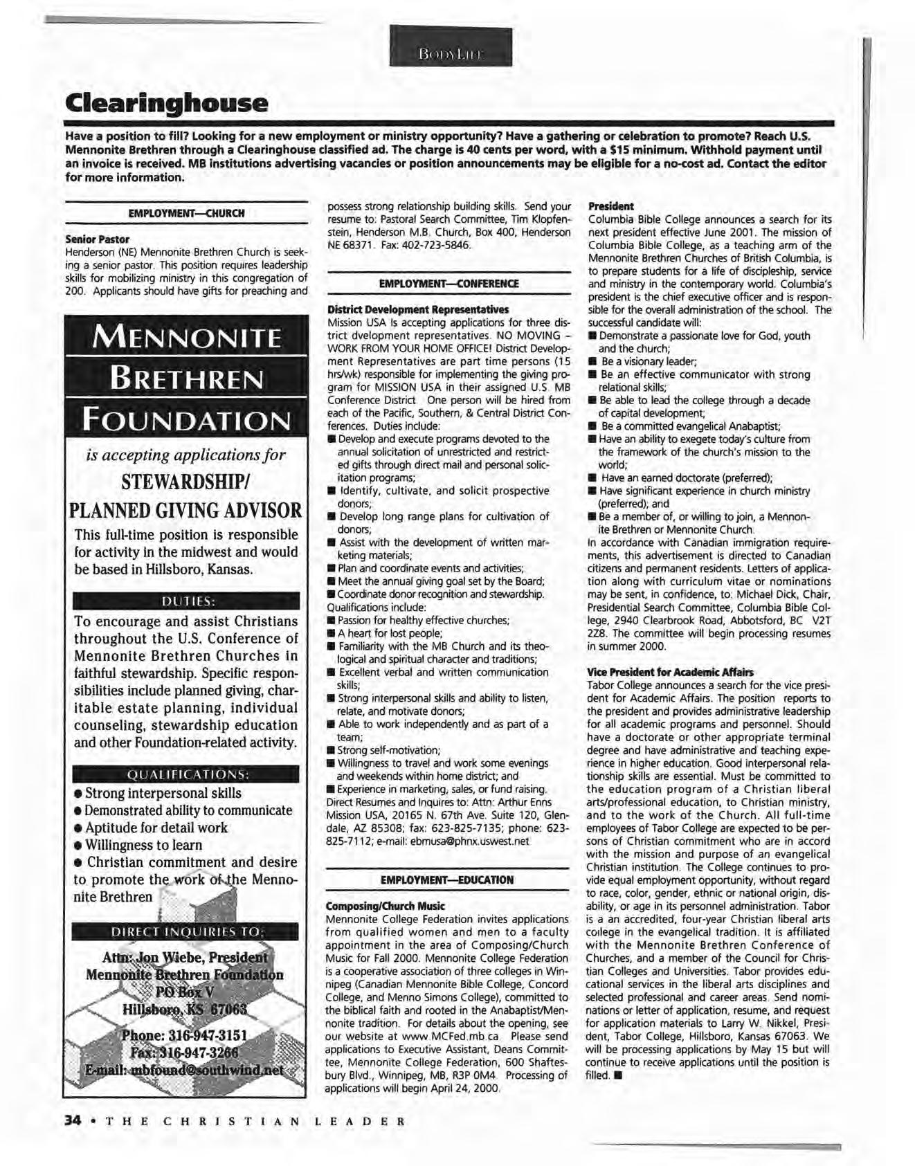 Mennonite College Federation invites applications from qualified women and men to a faculty appointment in the area of Composing/Church Music for Fall 2000. Mennonite College Federation is a cooperative association of three colleges in Winnipeg (Canadian Mennonite Bible College, Concord College, and Menno Simons College), committed to the biblical faith and rooted in the AnabaptistiMennonite tradition. For details about the opening, see our website at www.MCFed.mb.ca. Please send applications to Executive Assistant, Deans Committee, Mennonite College Federation, 600 Shaftesbury Blvd., Winnipeg, MB, R3P OM4. Processing of applications will begin April 24, 2000.